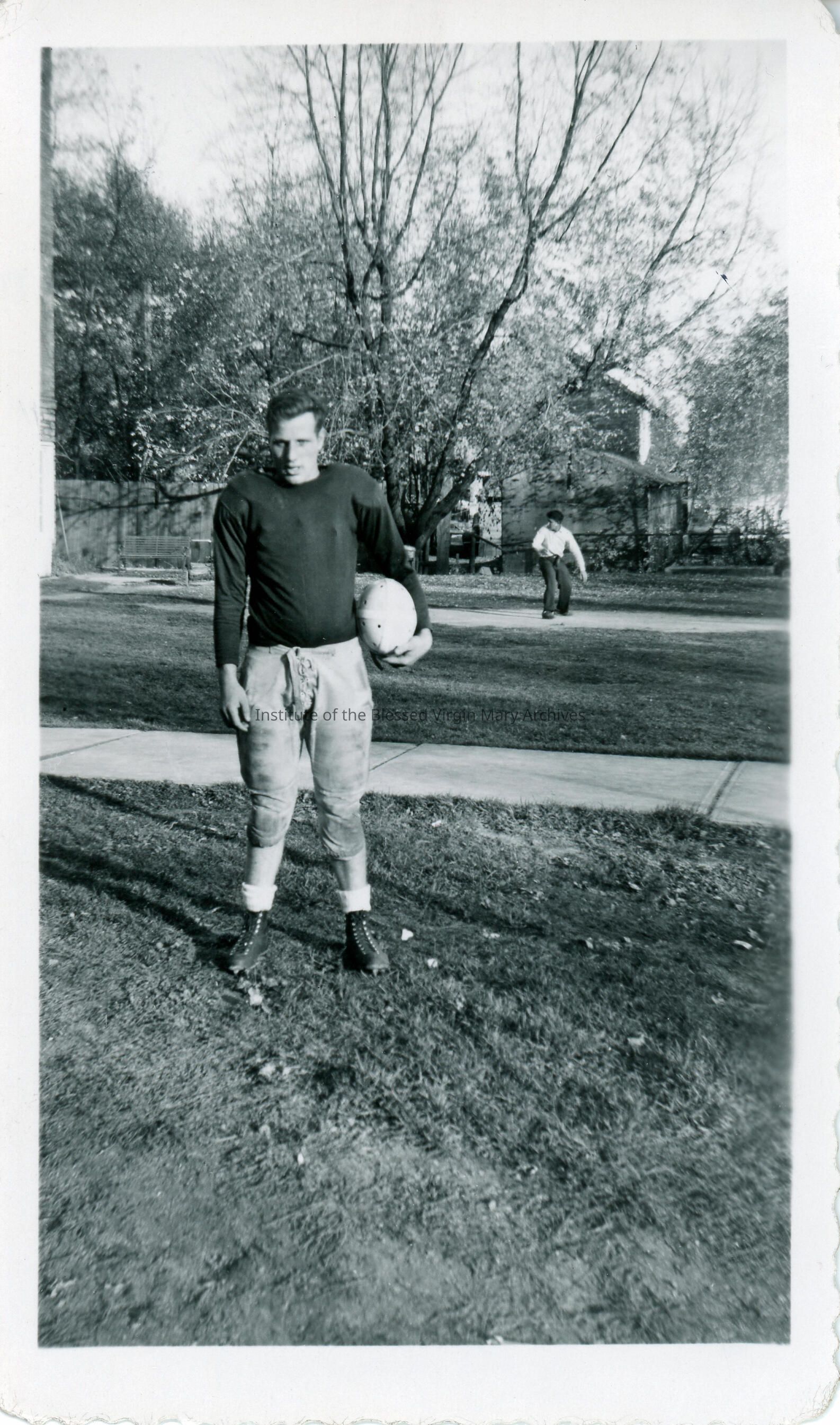Student football player at Loretto Academy/Loretto High School in Sault Ste. Marie, Michigan. Founded in 1896, the academy's location at 377 Armory Place (pictured) opened in 1899 and underwent a substantial addition in 1910. Converted into a co-ed high school in 1944, it was demolished in 1966 after Loretto Catholic Central High School was constructed.