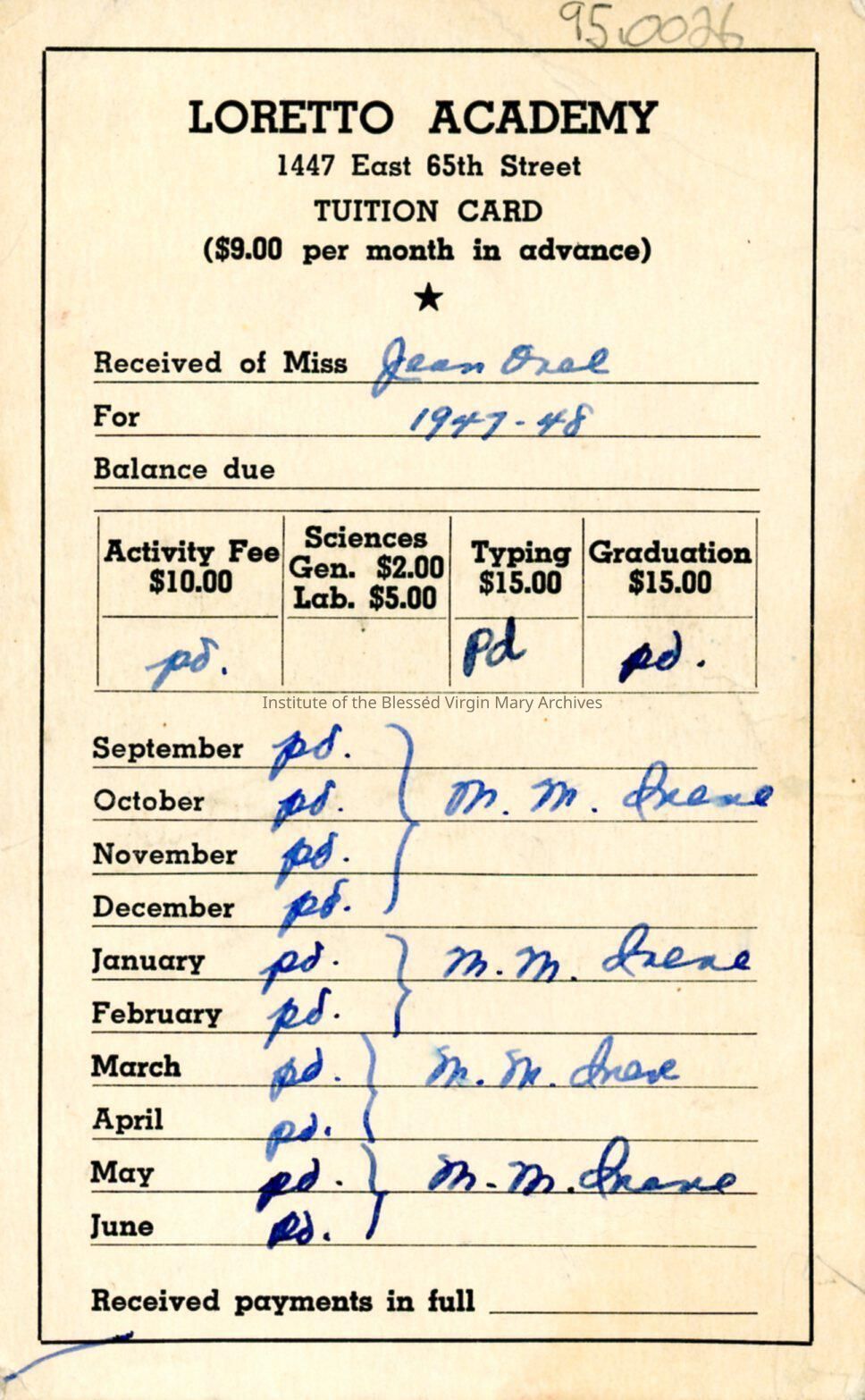 Loretto Academy Woodlawn tuition card for Jean Orel. It lists payment as nine dollars per month in addition to various fees.