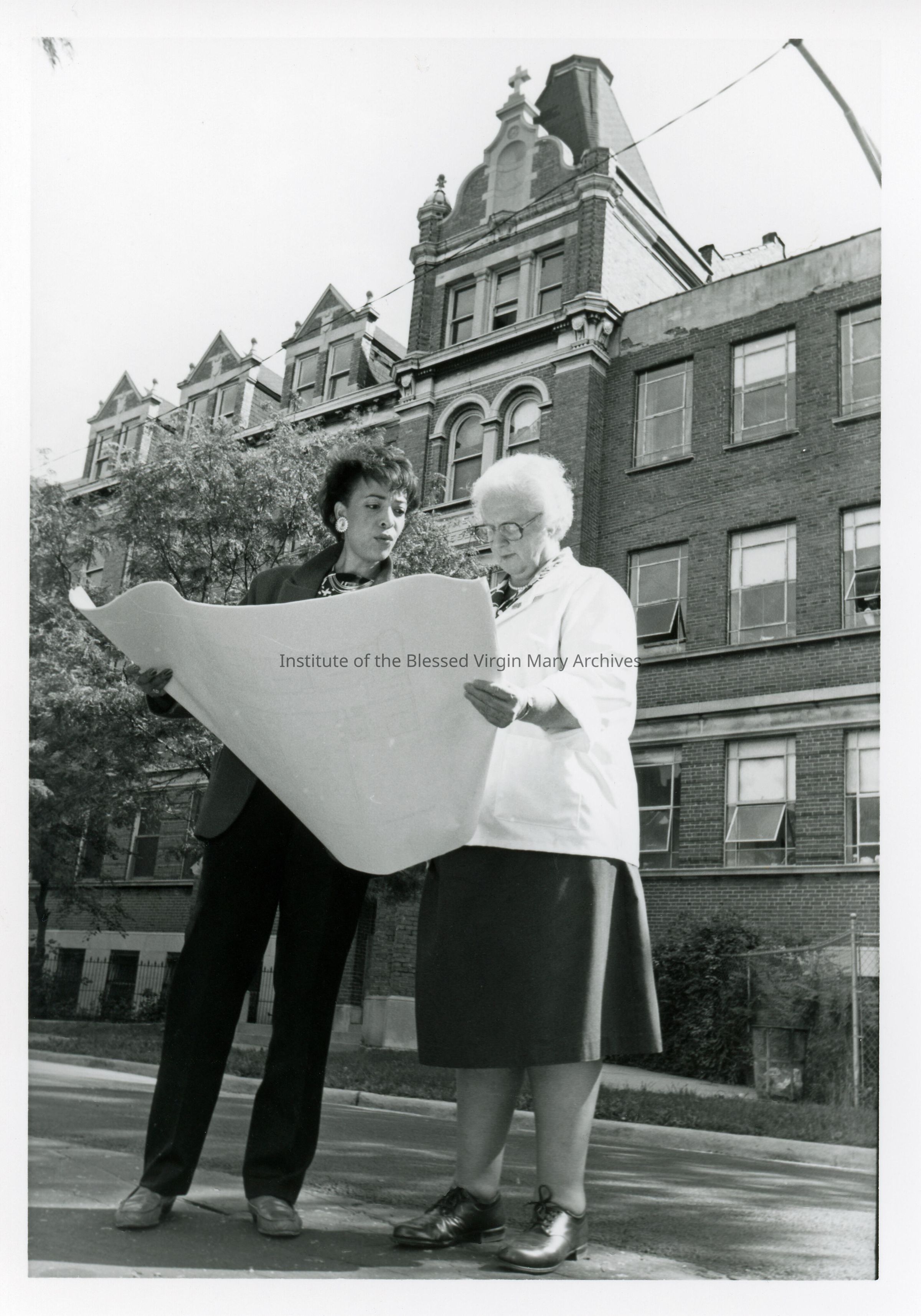 Standing near the entrance of the former Loretto Academy Woodlawn, Lauren E. Allen, left, and Sister Patricia (Anastasia) O'Connor discuss future plans for the structure. Allen was Vice President of Planning and Development for The Woodlawn Organization (TWO).