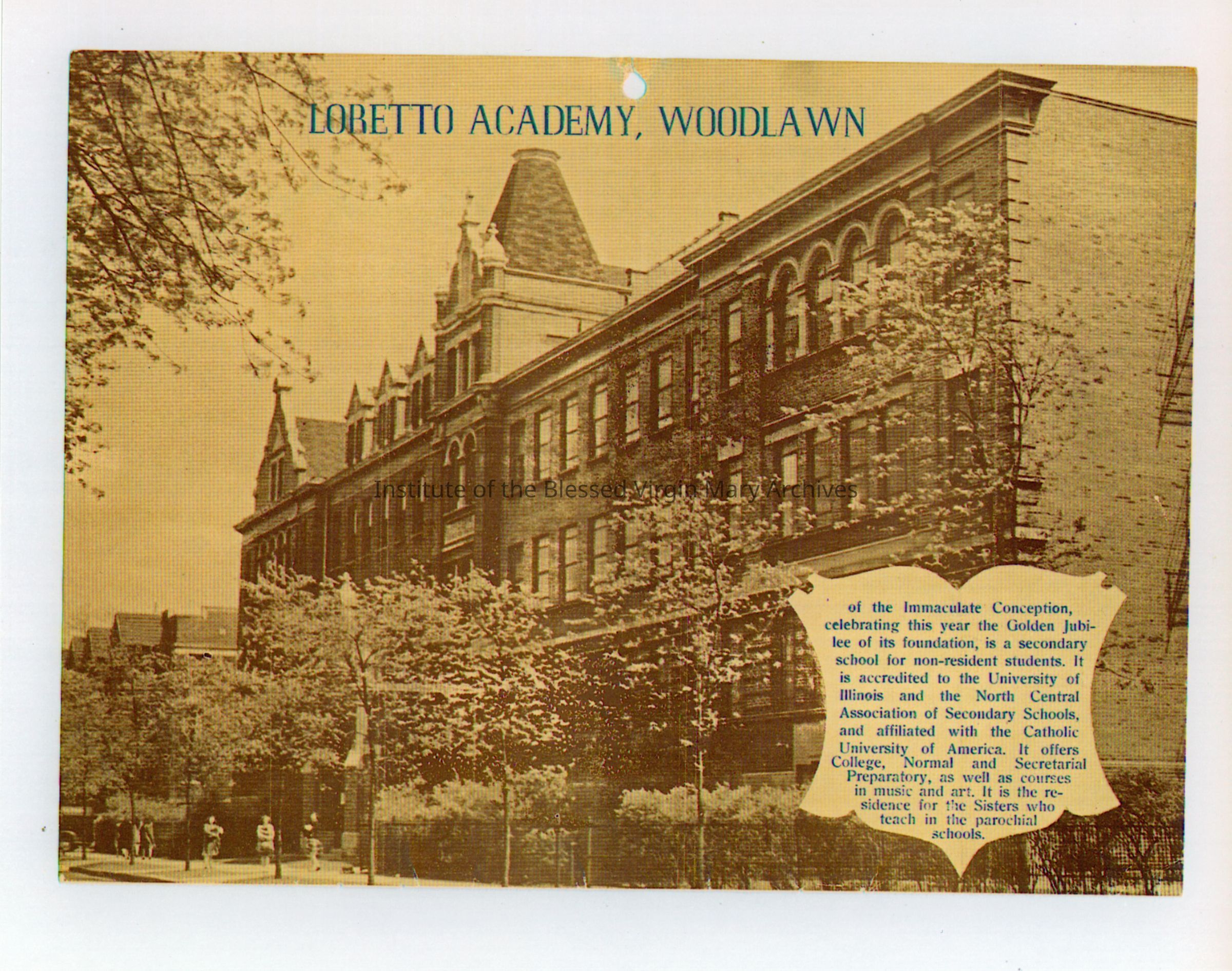 In 1905, the IBVM Sisters were invited to build a school in the Chicago community of Woodlawn. Located at 1447 East 65th Street, Loretto Academy formally opened in August of 1906 and operated until 1972. Following its closure, the school merged with Mercy High School to form Unity High School. Later, the building was sold to The Woodlawn Community Development Corporation and served in various capacities.Context