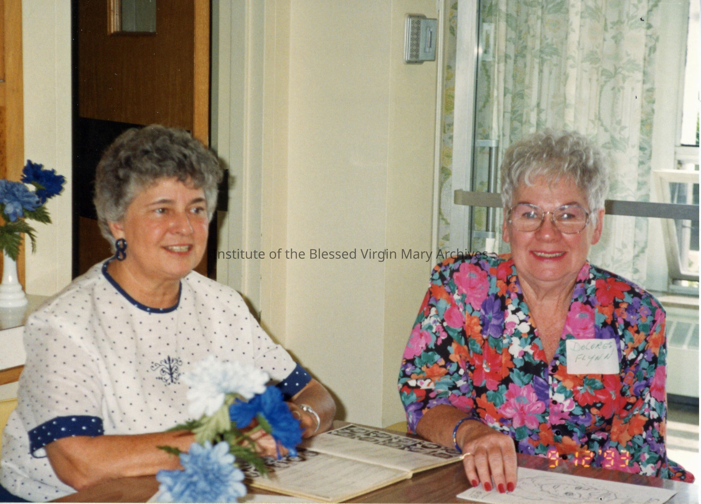 Loretto Academy Woodlawn 50th Anniversary Reunion for the Class of 1943. The event was held at the Loretto Convent in Wheaton, Illinois. Sister Marguerite (Fidelis) Caulfield, left, and Dolores Flynn are pictured.