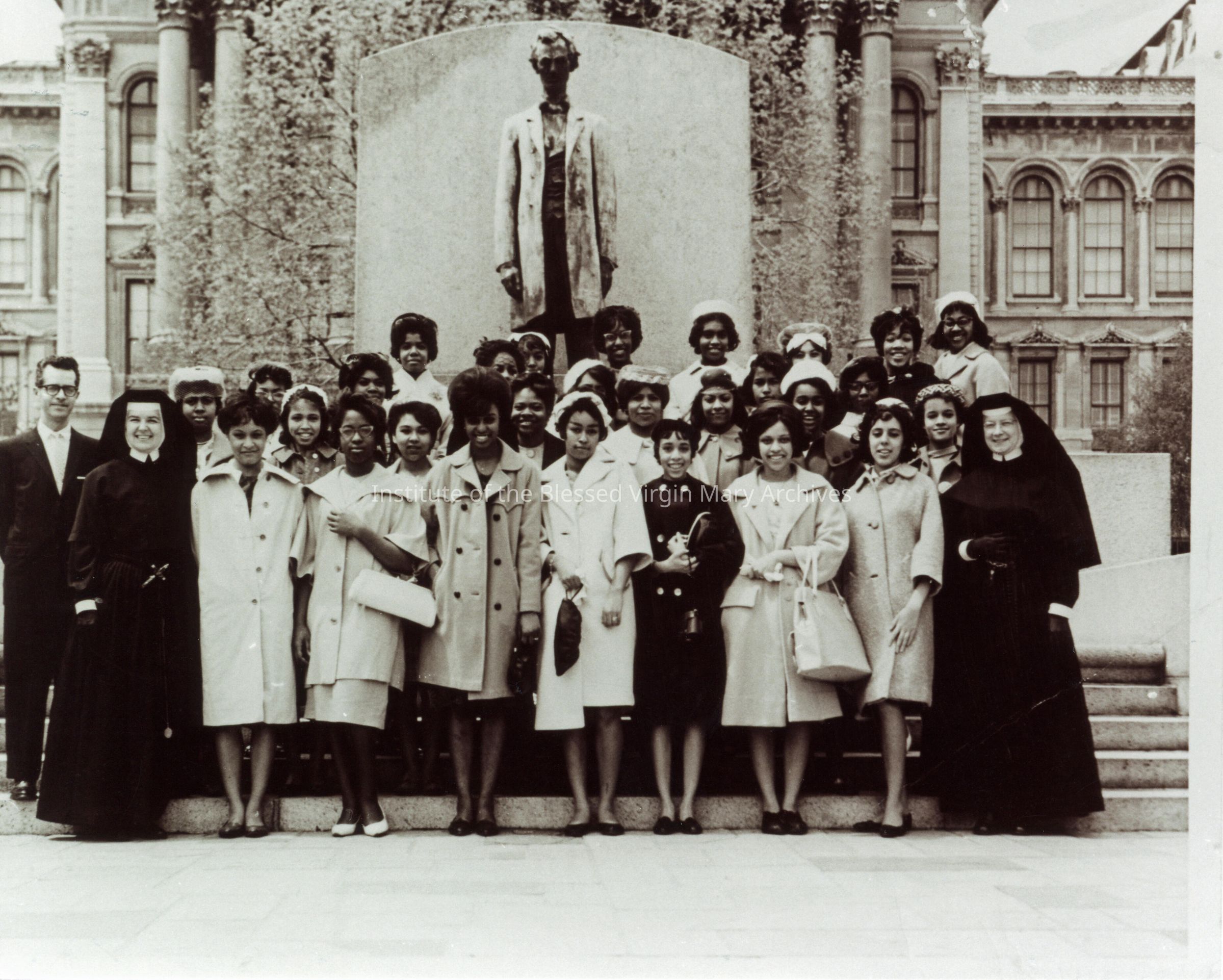 Loretto Academy Woodlawn trip to Springfield, Illinois. The junior class is posing near a statue of Abraham Lincoln in front of the Illinois State Capital. Sister Therese (Peter Claver) Rooney is on the far left and Sister Anita (Francesca) Esch is on the far right.
