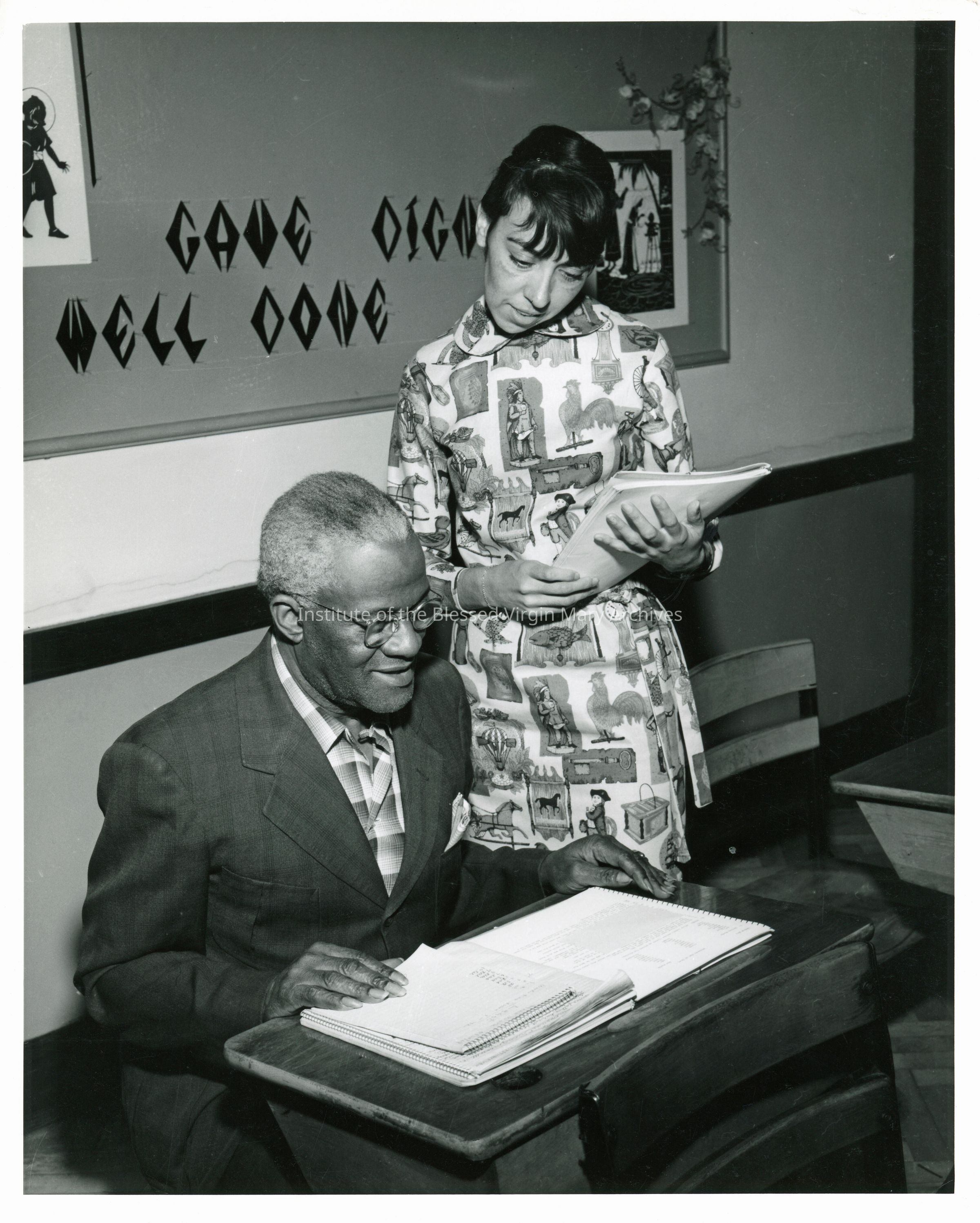 The Loretto Adult Education Center. Carmen Cardinez, a volunteer reading instructor from DePaul University, is assisting a student named Pete. Founded in 1964, the LAEC program worked to improve literacy, provide job training and award high school diplomas to low income adults and young adults.