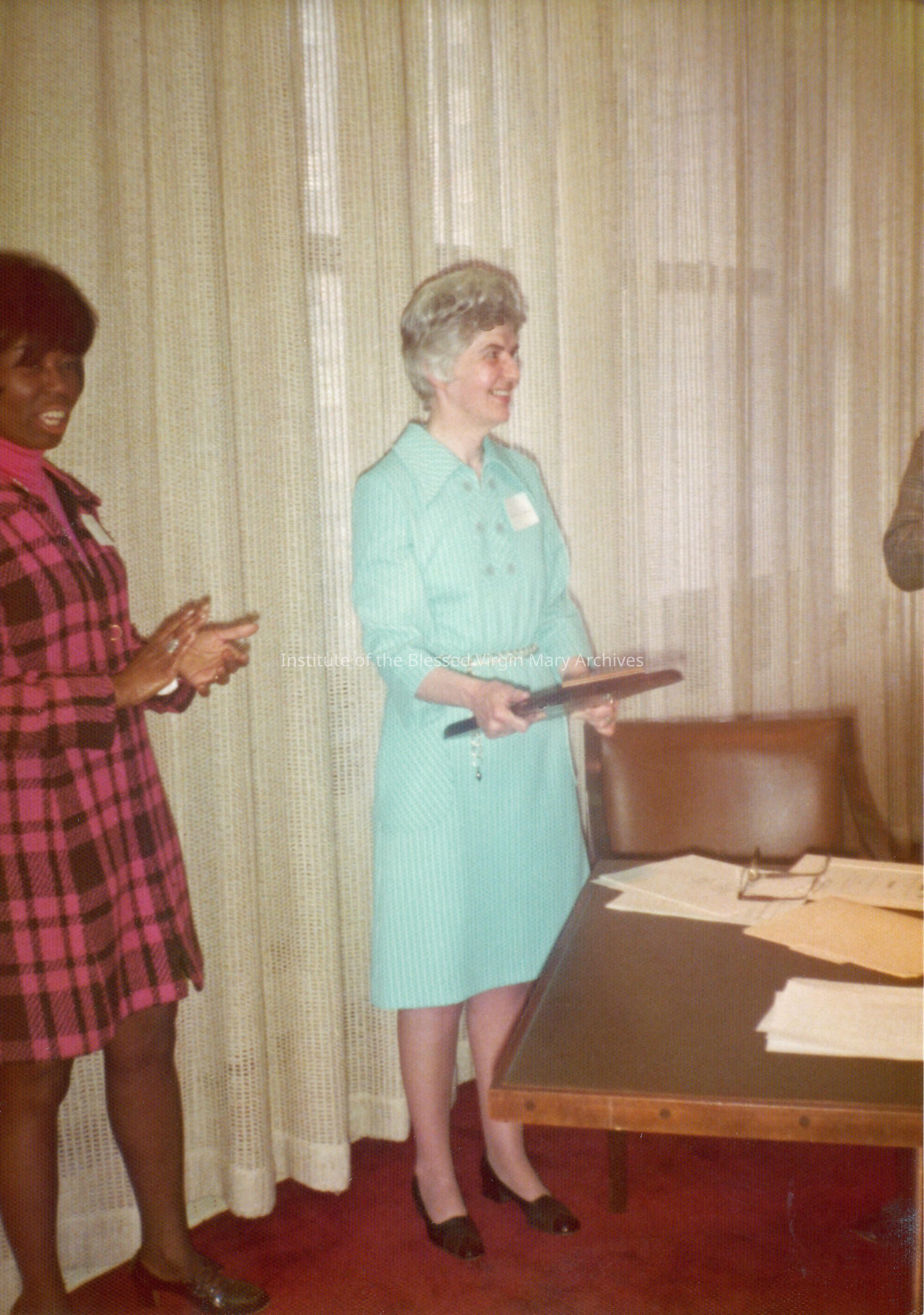 A ceremony, possibly graduation, for students of the Loretto Adult Education Center. Executive Director Sister Therese (Peter Claver) Rooney is standing in the center. Founded in 1964, the LAEC program worked to improve literacy, provide job training and award high school diplomas to low income adults and young adults.
