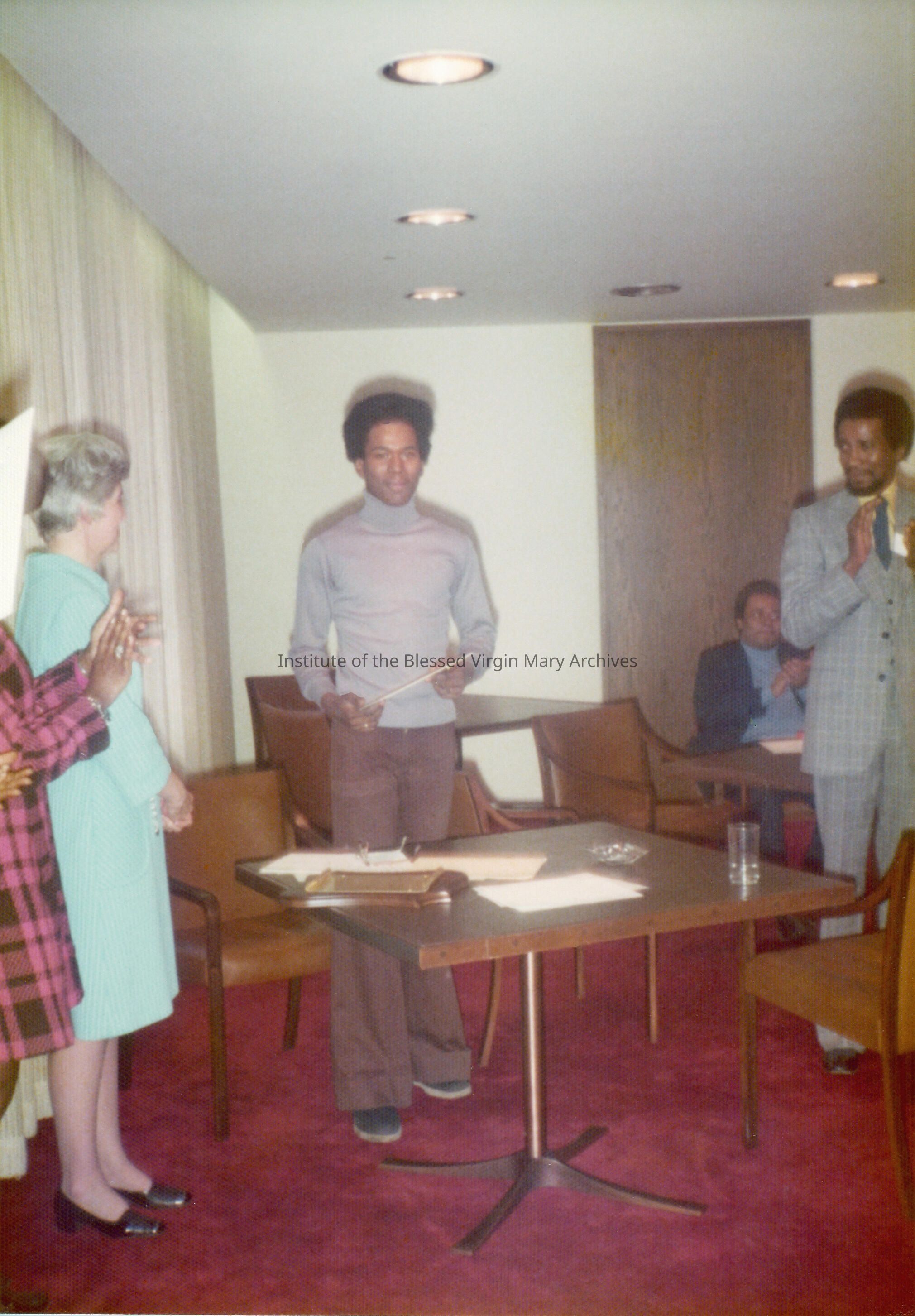 A ceremony, possibly graduation, for students of the Loretto Adult Education Center. Executive Director Sister Therese (Peter Claver) Rooney is standing on the left. Founded in 1964, the LAEC program worked to improve literacy, provide job training and award high school diplomas to low income adults and young adults.