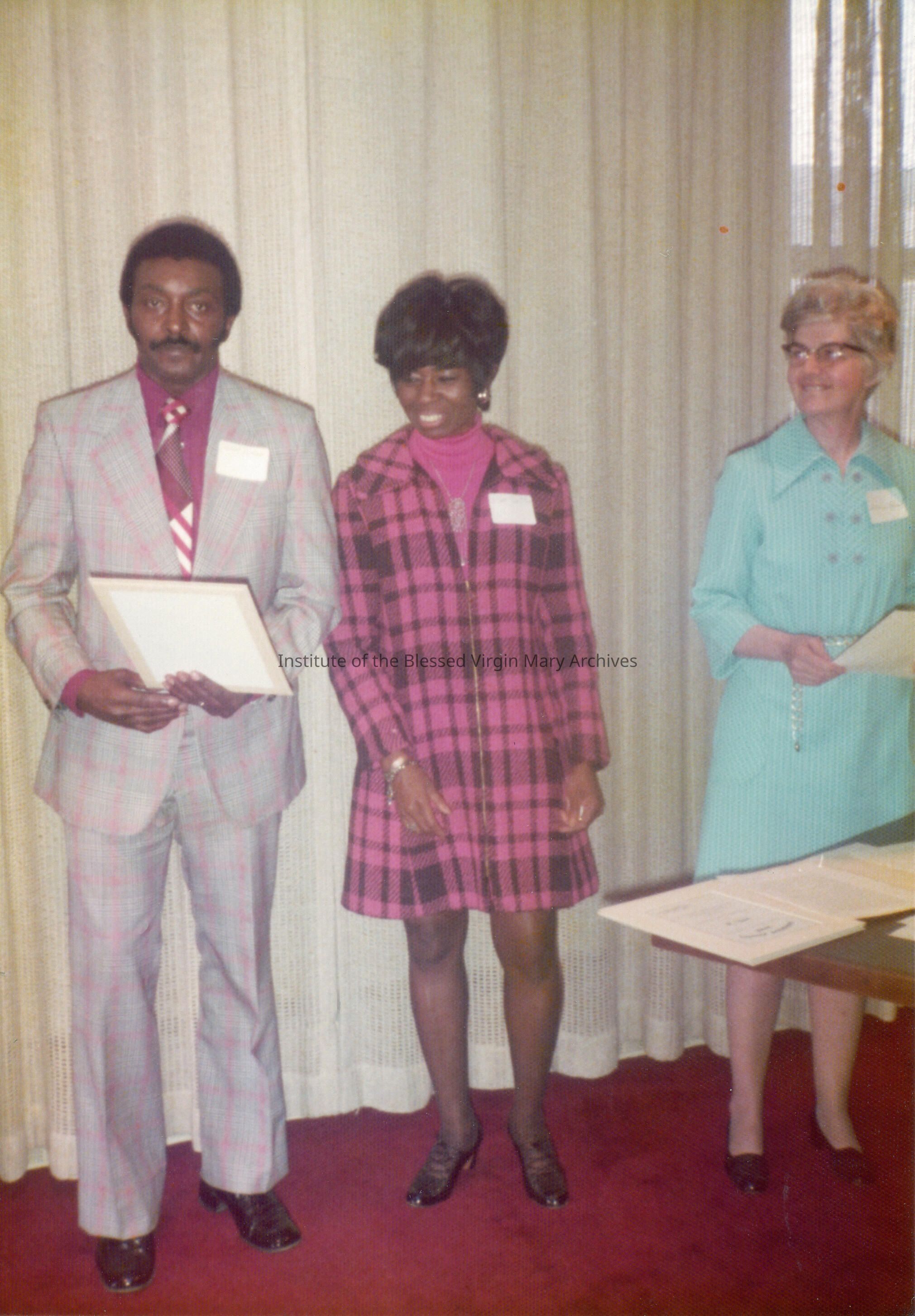 A ceremony, possibly graduation, for students of the Loretto Adult Education Center. Executive Director Sister Therese (Peter Claver) Rooney is standing on the right. Founded in 1964, the LAEC program worked to improve literacy, provide job training and award high school diplomas to low income adults and young adults.