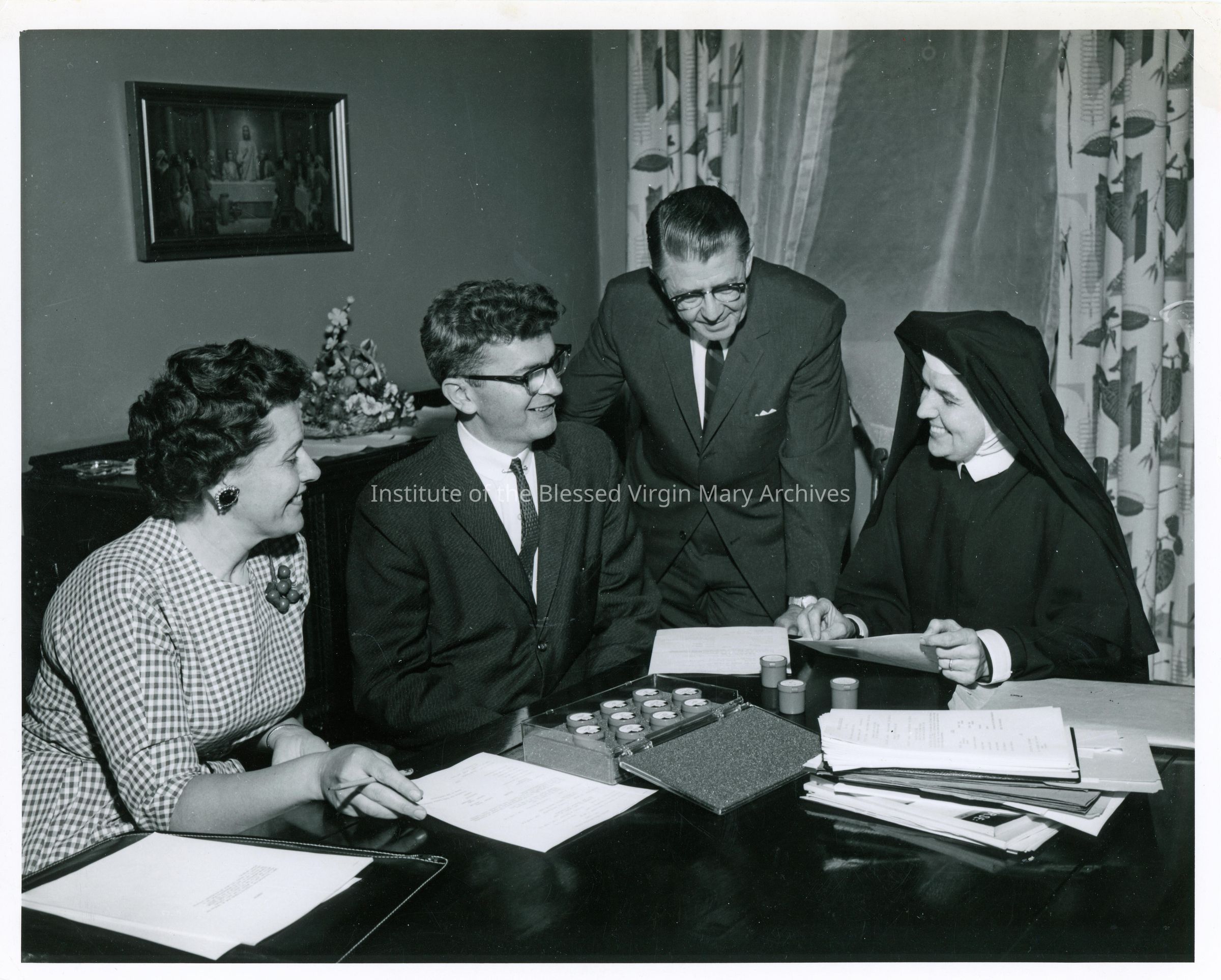 A meeting of the Loretto Adult Education Center. From left to right are Helen Sorenson from the University of Illinois, Dr. William Gorman from DePaul University, John Hurst from the Skills Center and Executive Director Sister Therese (Peter Claver) Rooney. Founded in 1964, the LAEC program worked to improve literacy, provide job training and award high school diplomas to low income adults and young adults.