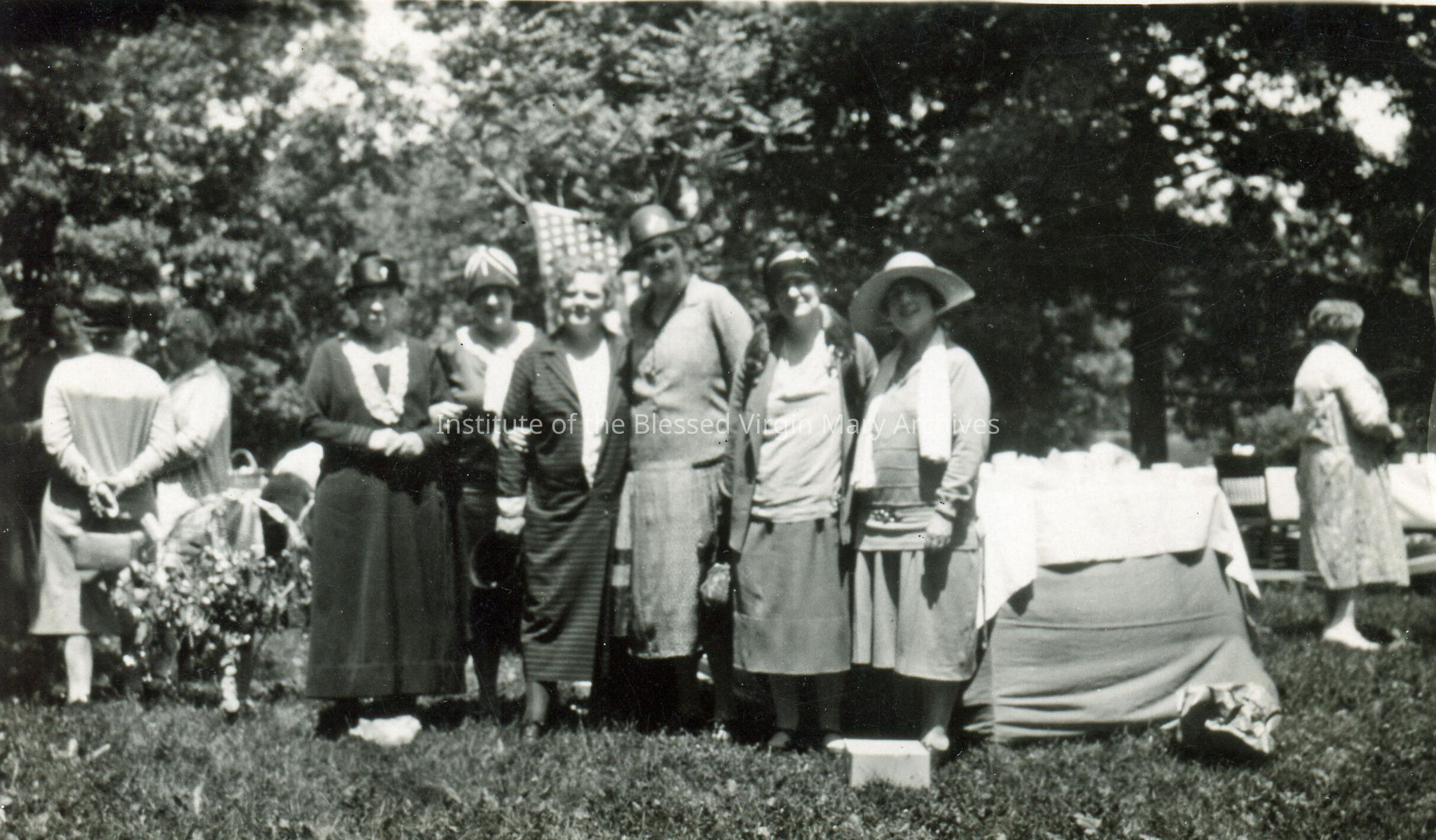 Picnic of the Loretto Auxiliary believed to have taken place in Englewood, Chicago. The organizations first president, Mrs. Albert Mracek, is third from the left. Loretto Academy, later Loretto High School, was located in the 6500 block of Stewart Avenue.
