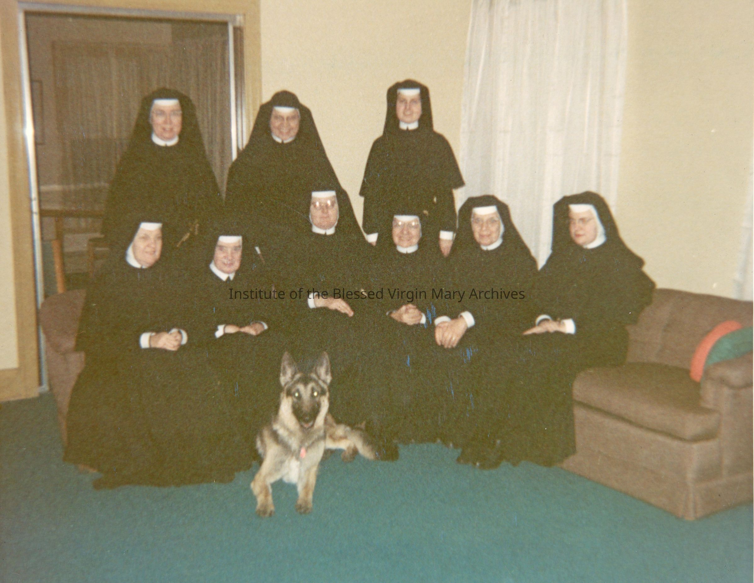 The Loretto Convent in Englewood, Chicago. The building was located in the 6500 block of Stewart Avenue next to Loretto Academy (later Loretto High School). Seated, from left to right, are Sister Genevieve (St. Bernadette) Burns, Sister Constance, Sister Mary (Gabriel) Gleason, Sister Marie (Stanislaus) Drummond, Sister Edna (Denise) Adams and Sister Nancy Lee (del Ray) Waite. Standing, from left to right, are Sister St. Marguerite (Maurus) Cavanaugh, Sister Mary (Sylvester) Pozega and Sister Jean Marie (Mary Richard) Okroi.