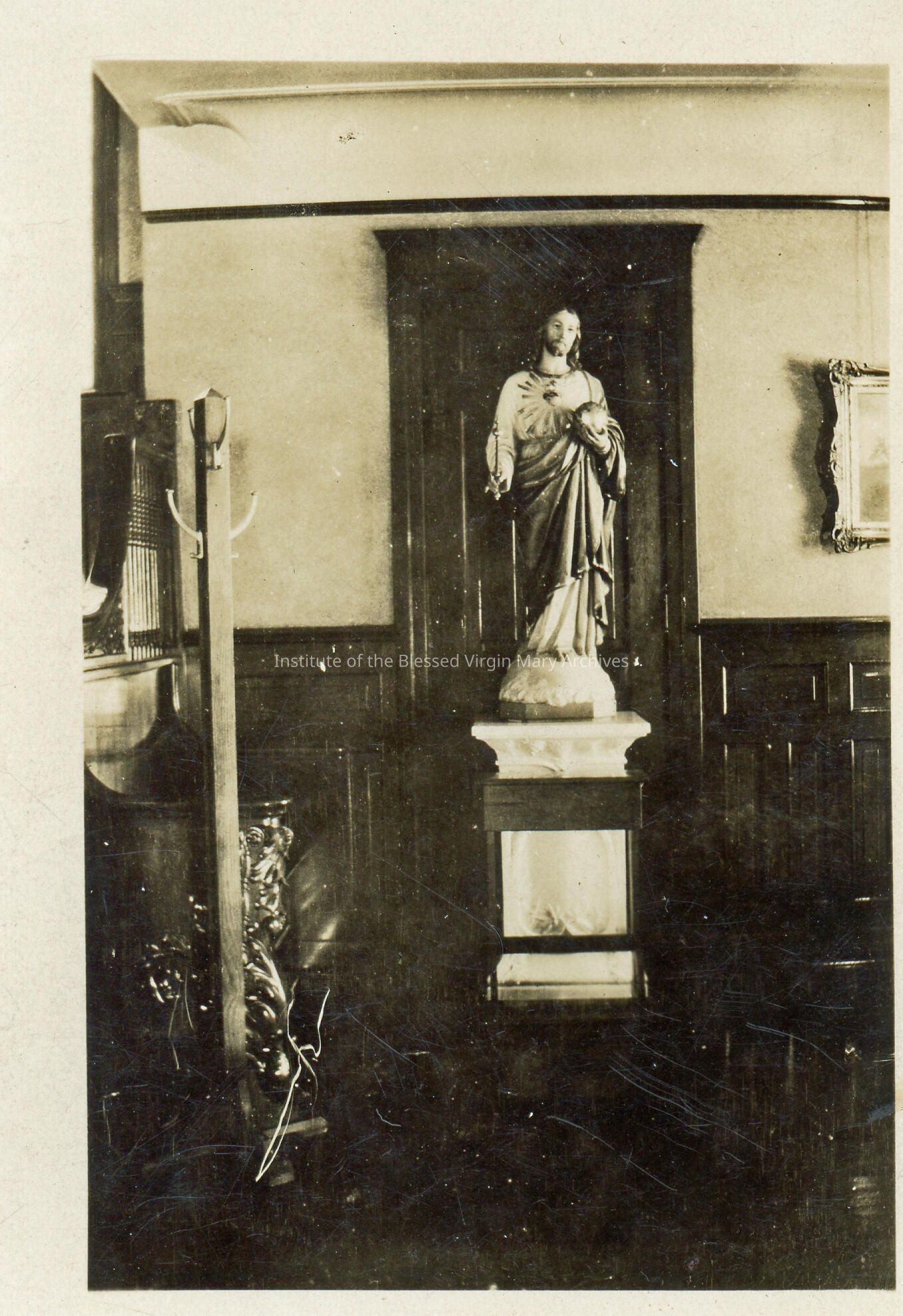 Interior of the Loretto Convent in Englewood, Chicago. The image features a statue of Jesus and a notation on the back states "In memory of Miss Swoop". The building was located in the 6500 block of Stewart Avenue next to Loretto Academy (later Loretto High School).
