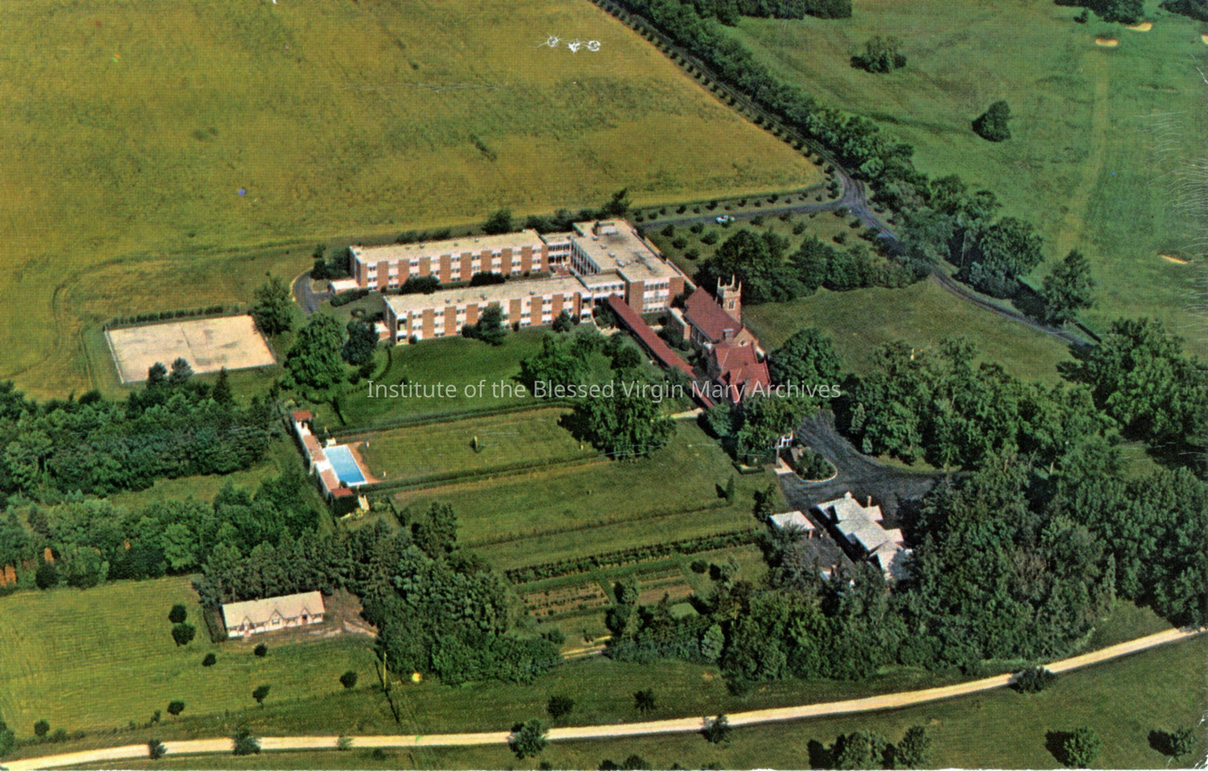 Postcard featuring an aerial view of the Loretto Convent in Wheaton. It was sent to the IBVM community at St. Philomene's in Sacramento, California and has a handwritten message on the back.