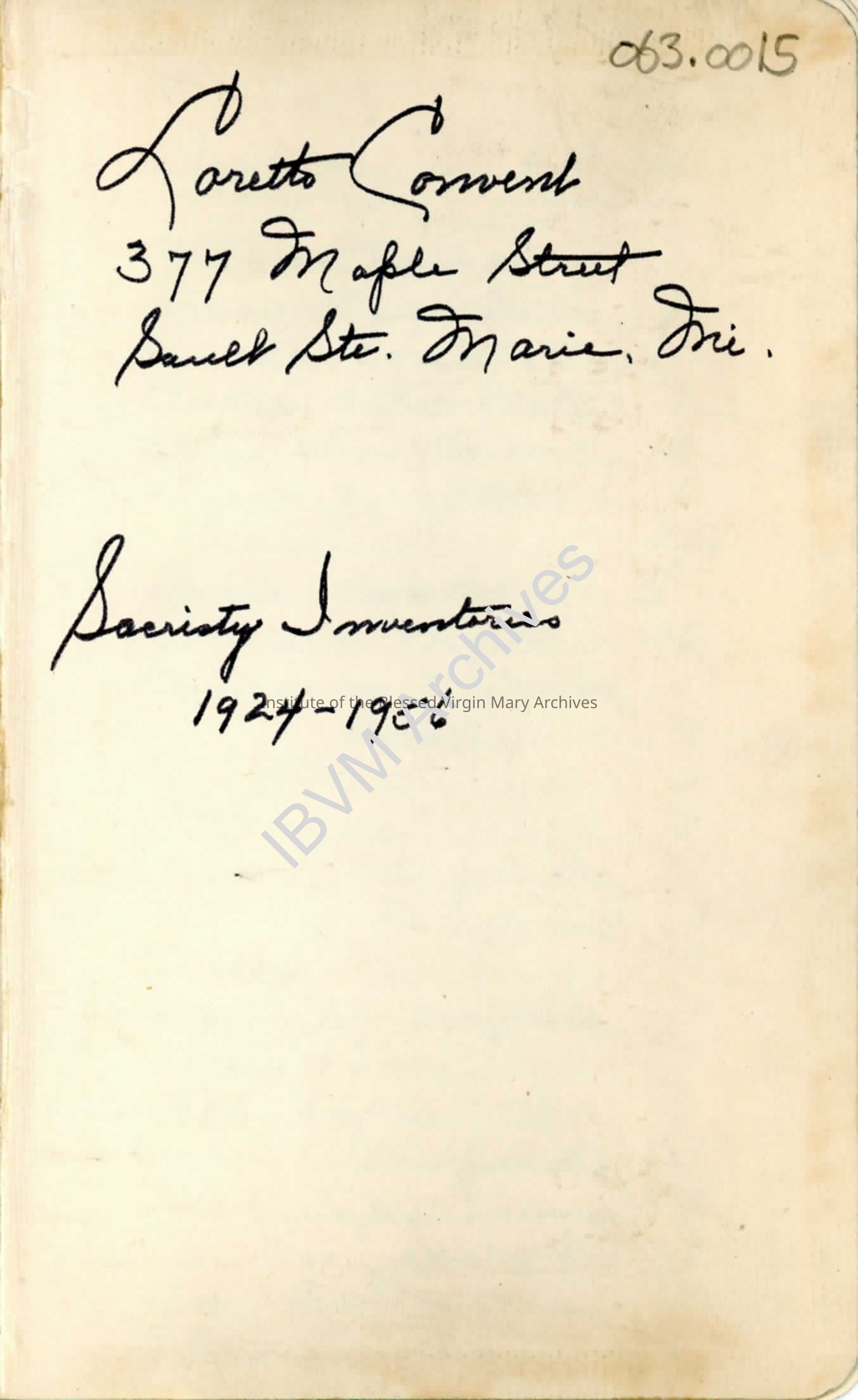 Sault Ste. Marie Sacristy inventories ranging from 1924 - 1956. Numerous items are listed including vestments, candelabra, veils, flowers, lamps, bookends and more. The Loretto Convent was first located in Loretto Academy at 377 Armory Place. In 1955, a new convent was constructed at 377 Maple Street.