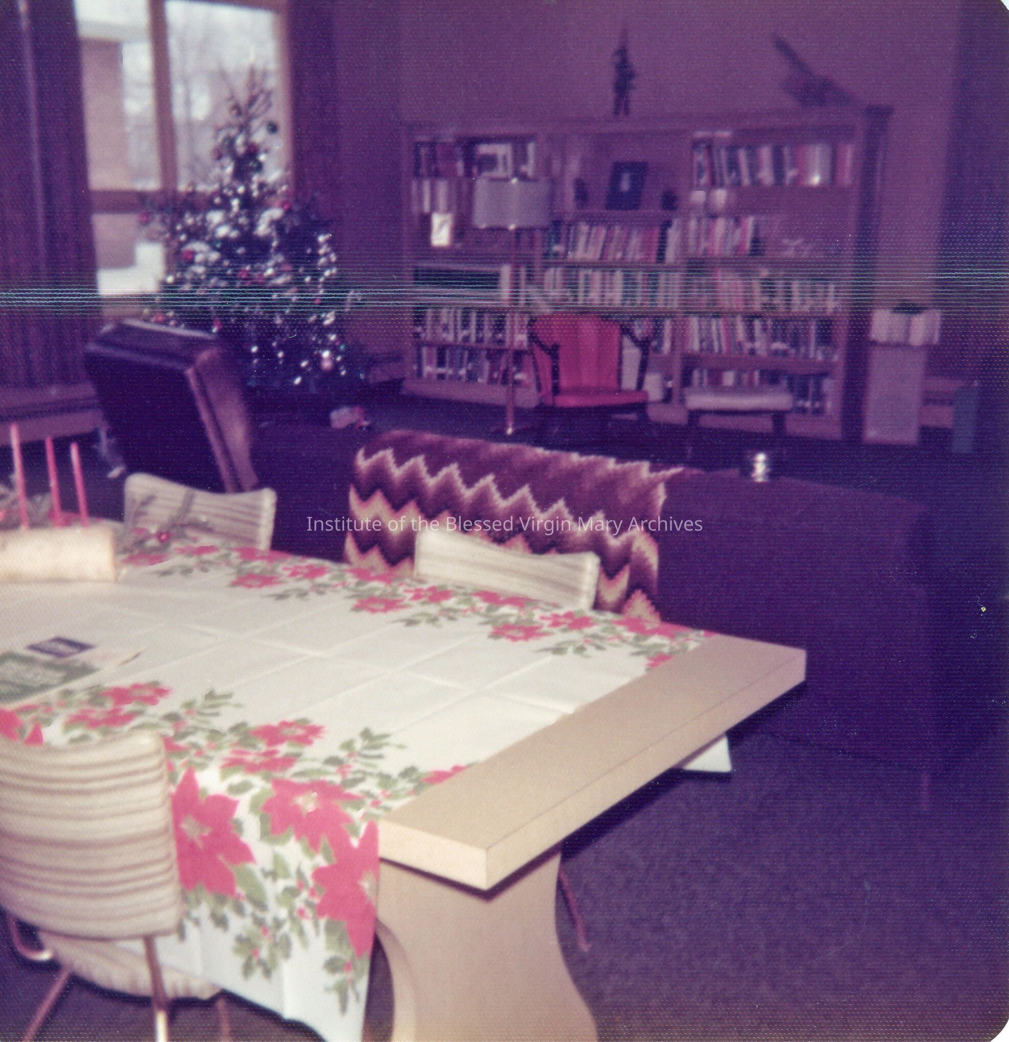 Loretto Convent located at 377 Maple Street in Sault Ste. Marie, Michigan. This image features the community room at Christmas. Completed in 1956, the building remained with the IBVM until 1985. Previously, the convent was housed in Loretto Academy at 377 Armory Place.