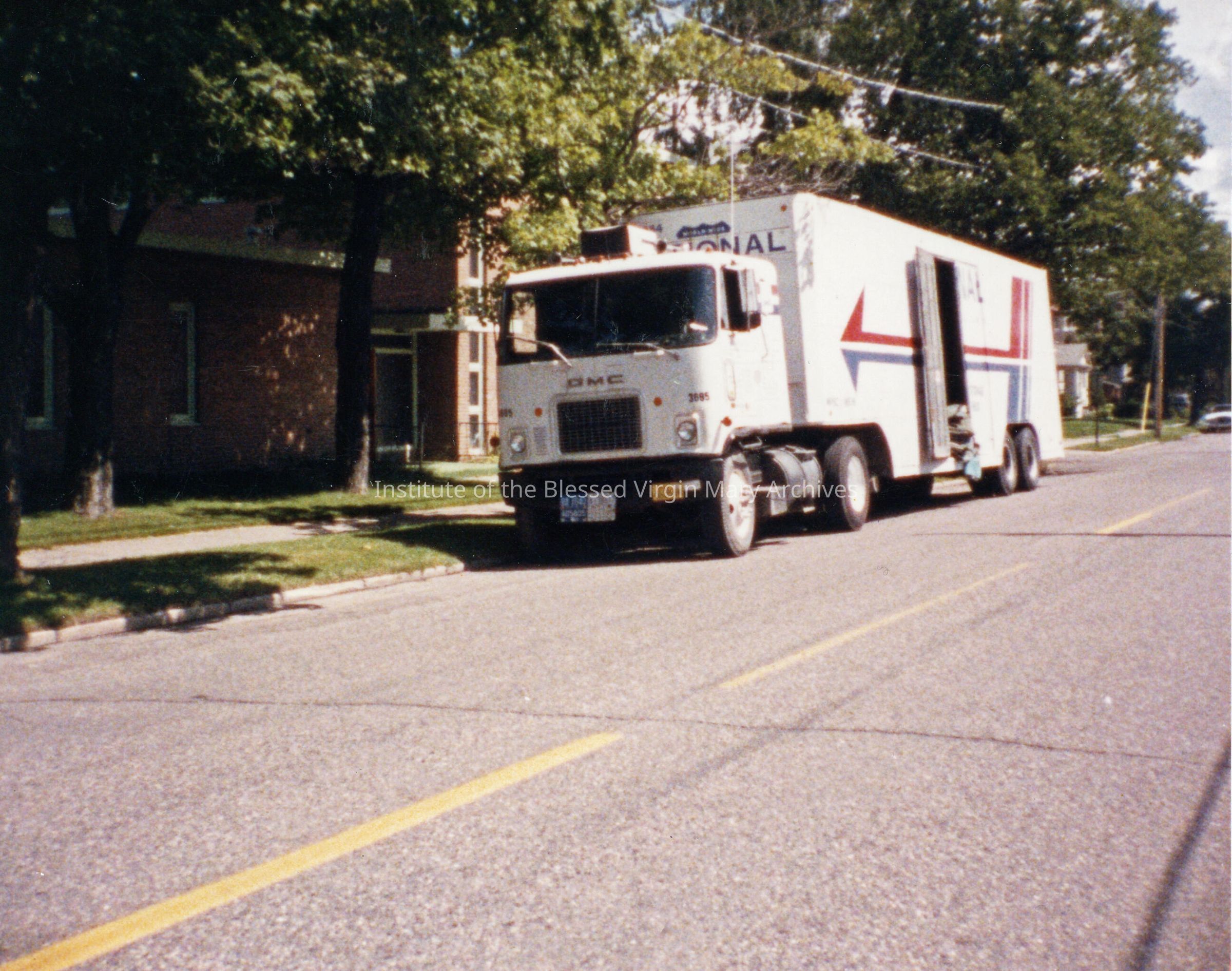 Loretto Convent located at 377 Maple Street in Sault Ste. Marie, Michigan. This image features a moving truck and was taken on the last day in the Sault. Completed in 1956, the building remained with the IBVM until 1985. Previously, the convent was housed in Loretto Academy at 377 Armory Place.