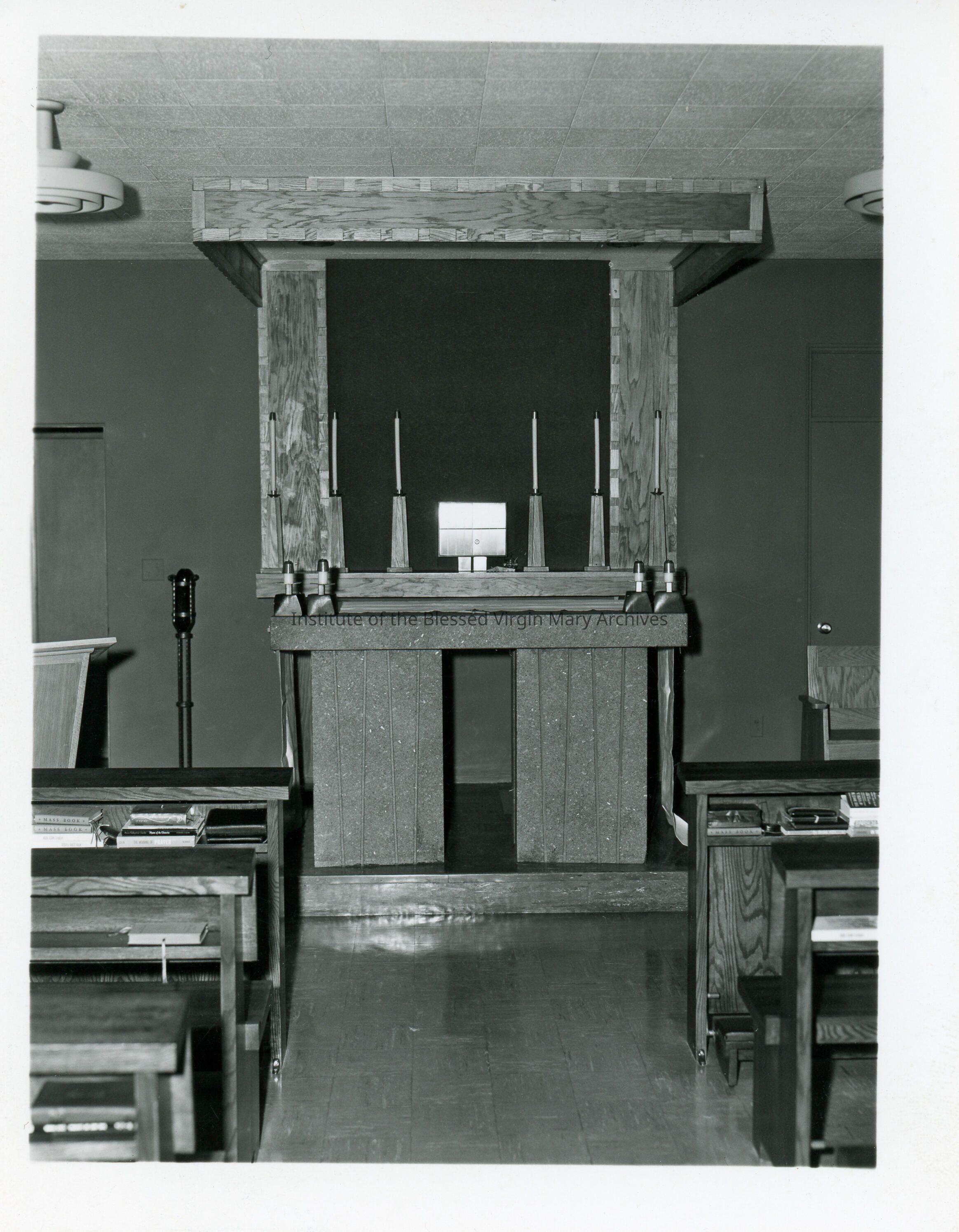 Loretto Convent located at 377 Maple Street in Sault Ste. Marie, Michigan. This image features the convent's chapel. Completed in 1956, the building remained with the IBVM until 1985. Previously, the convent was housed in Loretto Academy at 377 Armory Place.