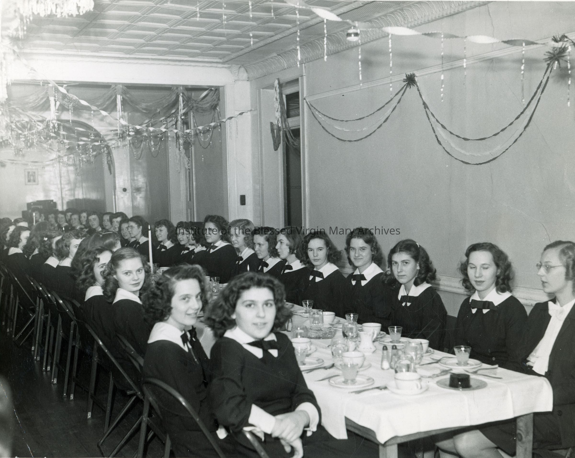 Gathering at the IBVM Convent in Sault Ste. Marie, Michigan. There are a number of students seated at tables. From 1899 - 1956, the convent was located in Loretto Academy at 377 Armory Place. Afterward, a new building was constructed at 377 Maple Street.