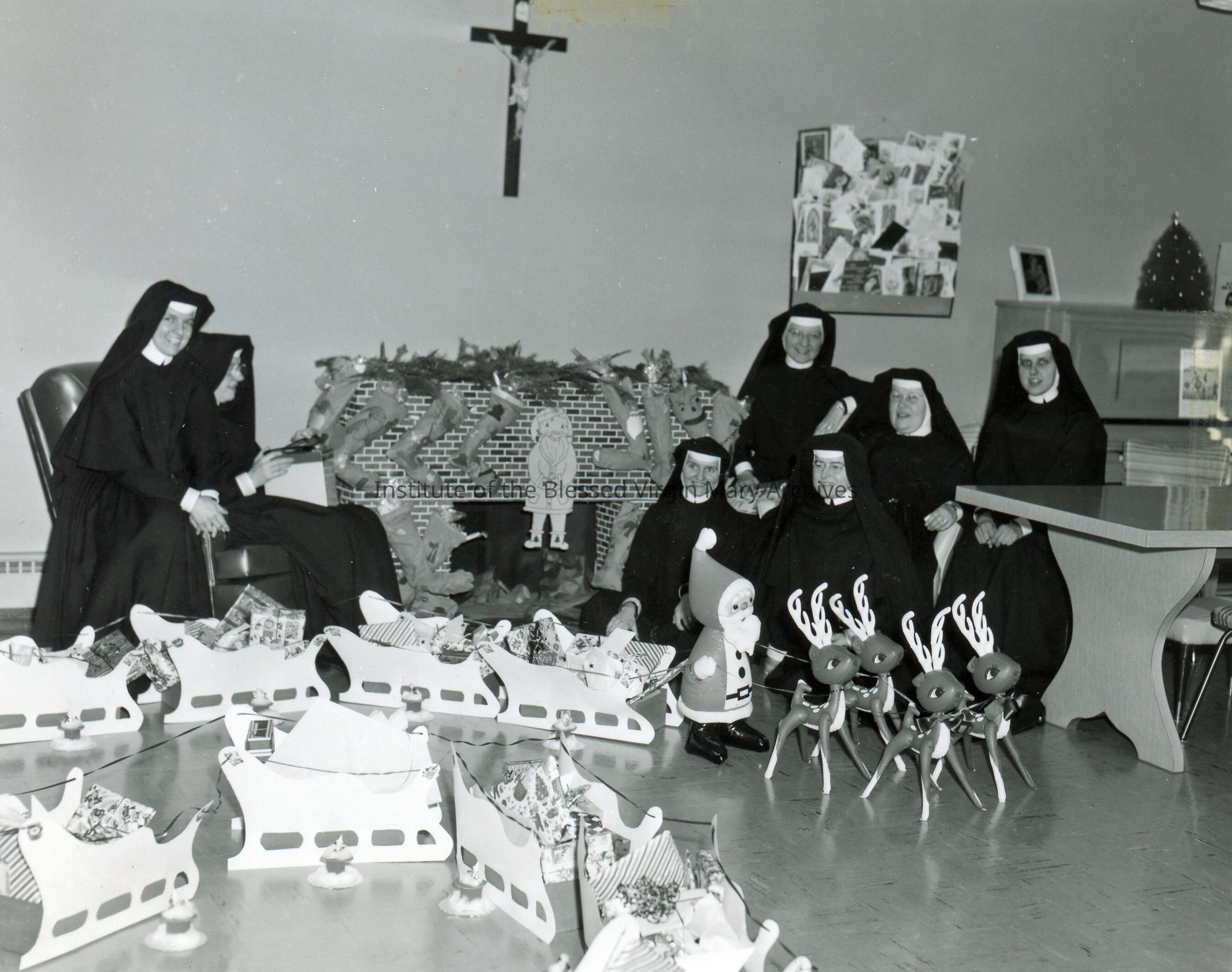 Loretto Convent located at 377 Maple Street in Sault Ste. Marie, Michigan. This image features Sisters celebrating Christmas. Completed in 1956, the building remained with the IBVM until 1985. Previously, the convent was housed in Loretto Academy at 377 Armory Place.