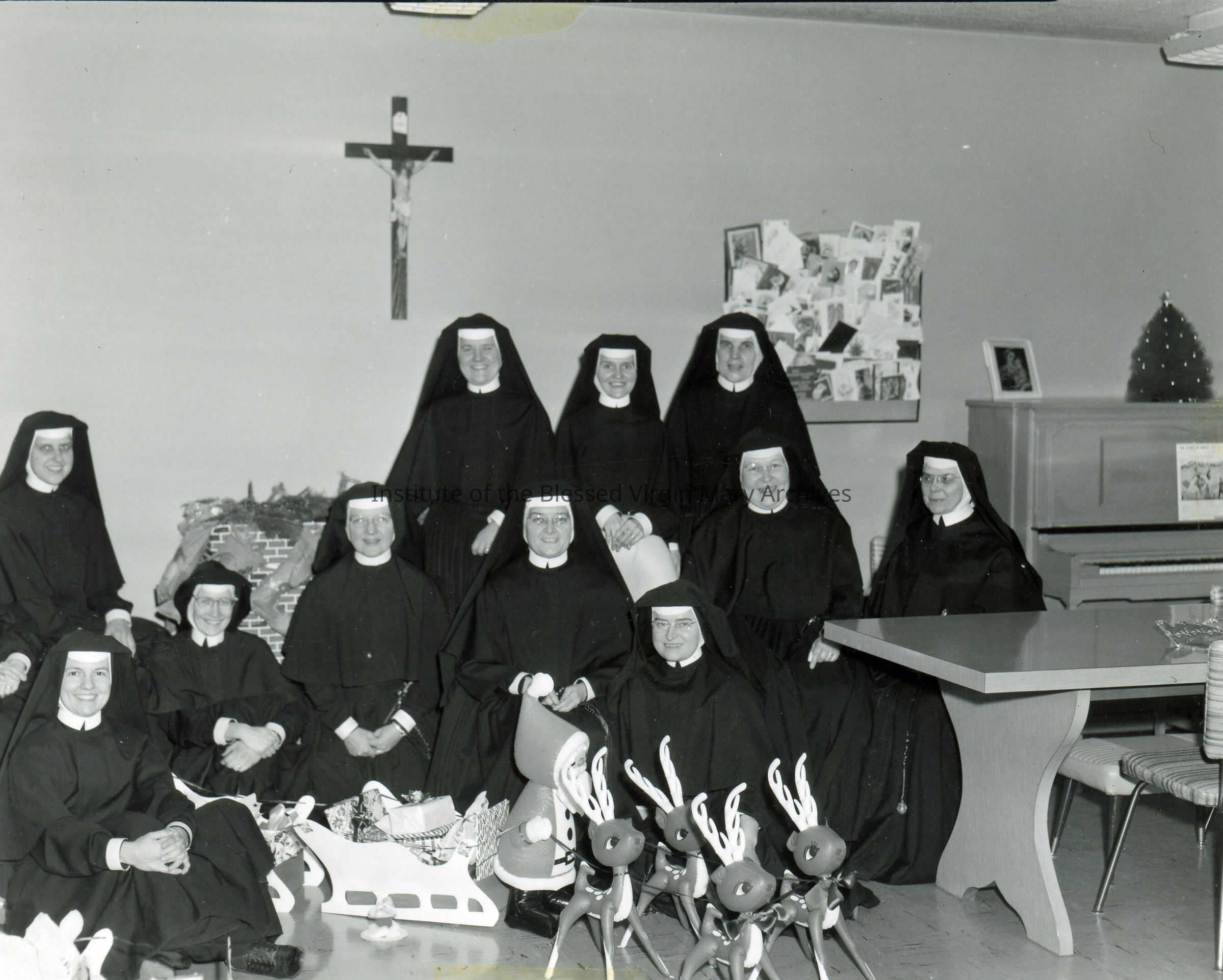 Loretto Convent located at 377 Maple Street in Sault Ste. Marie, Michigan. This image features Sisters celebrating Christmas. In the first row, from left to right, are Sister Lucille (Jane Frances) DuCharme, Sister Mary Catherine (Jeanette) Shean, Sister Virginia (Alice) Whitehead, Sister Nora (St. Catharine) Lowe, Sister Mildred Weinberger, Sister Alberta (Eleanor) Holland and Sister Mary Elizabeth (Benita) Bannon. In the back row, from left to right, are Sister Anita (Anne) Hyzy, Sister Joan (Pat) Pendleton, Sister Catherine (Mary Andre) Hensel and Sister Roberta (Corrine) Thiebert. Completed in 1956, the building remained with the IBVM until 1985. Previously, the convent was housed in Loretto Academy at 377 Armory Place.