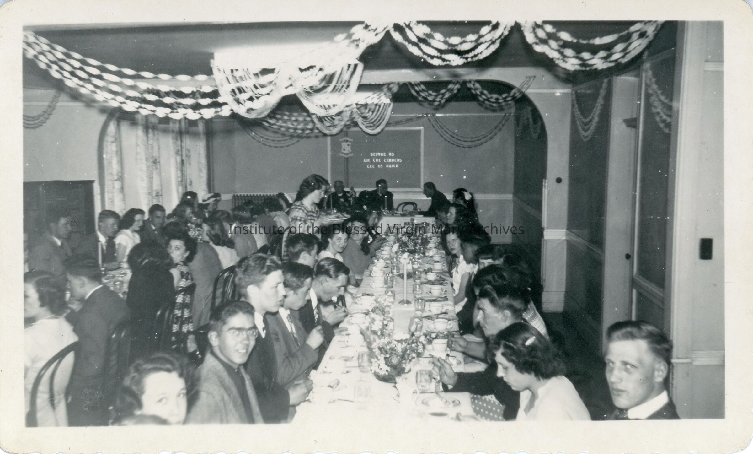 Gathering at the IBVM Convent in Sault Ste. Marie, Michigan. There are a number of students seated at tables. On the wall is the phrase "Before us lie the timbers, let us build". From 1899 - 1956, the convent was located in Loretto Academy at 377 Armory Place. Afterward, a new building was constructed at 377 Maple Street.