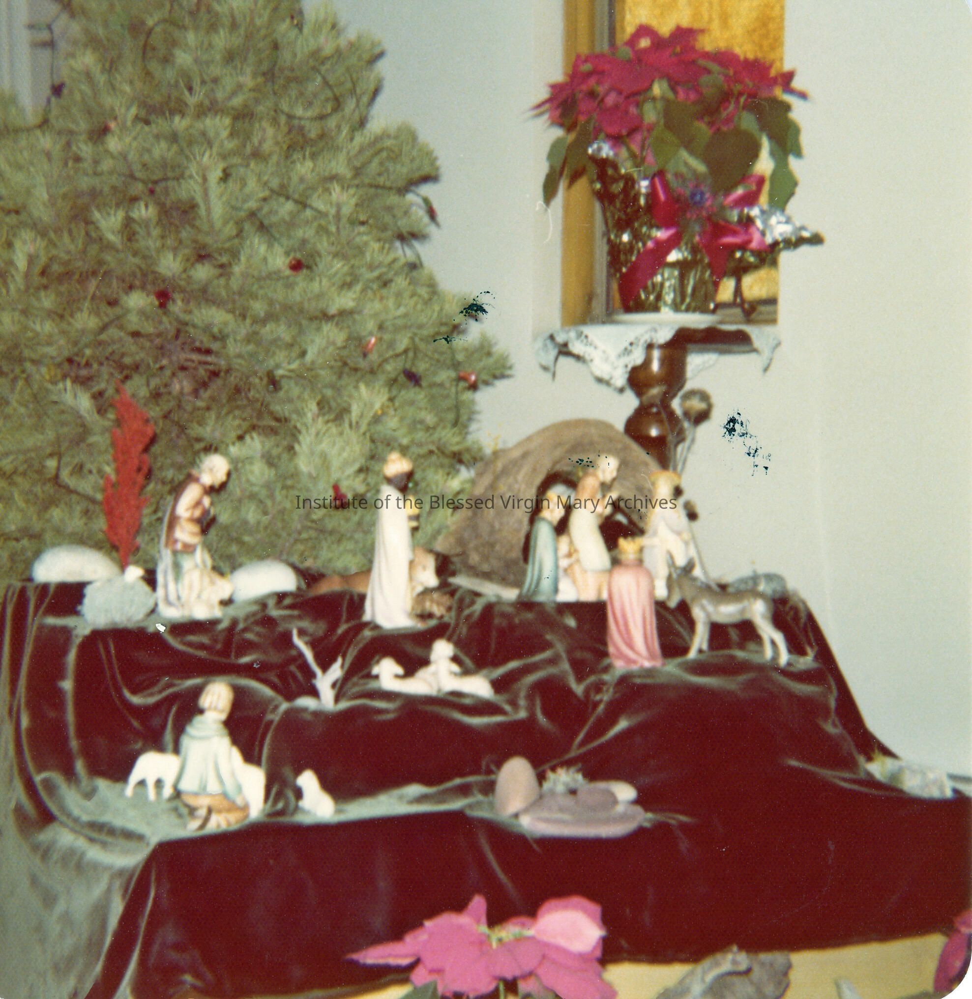Loretto Convent located at 377 Maple Street in Sault Ste. Marie, Michigan. This image features a Nativity display at Christmas. Completed in 1956, the building remained with the IBVM until 1985. Previously, the convent was housed in Loretto Academy at 377 Armory Place.