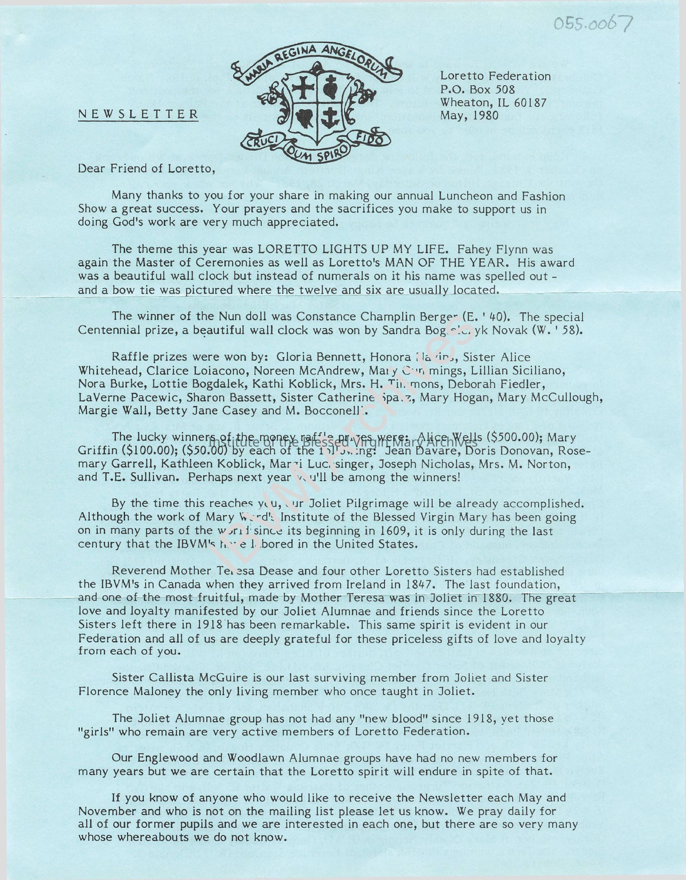 Loretto Federation newsletter written by Sister Mary Ellen Dennehy. It discusses the annual luncheon, the one hundredth anniversary of the IBVM in the United States, upcoming events and names of the recently deceased.Context