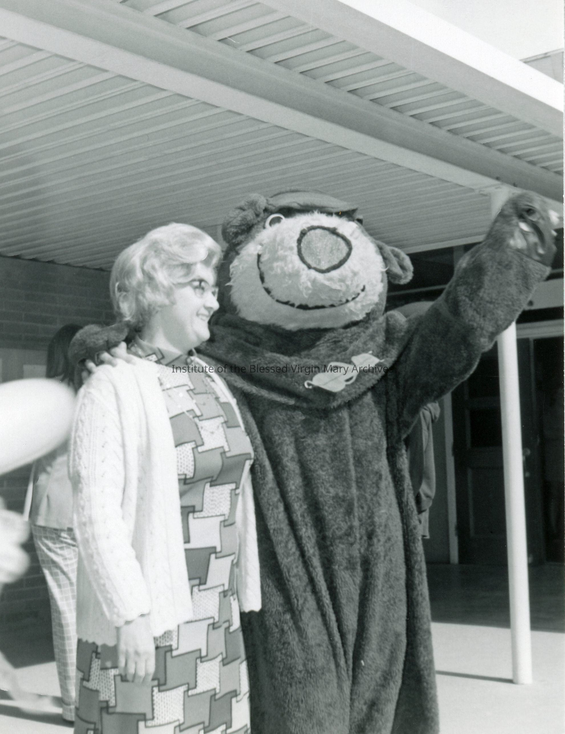 Loretto High School in Sacramento, California. This image features Sister Nora (St. Catharine) Lowe with a costumed mascot.