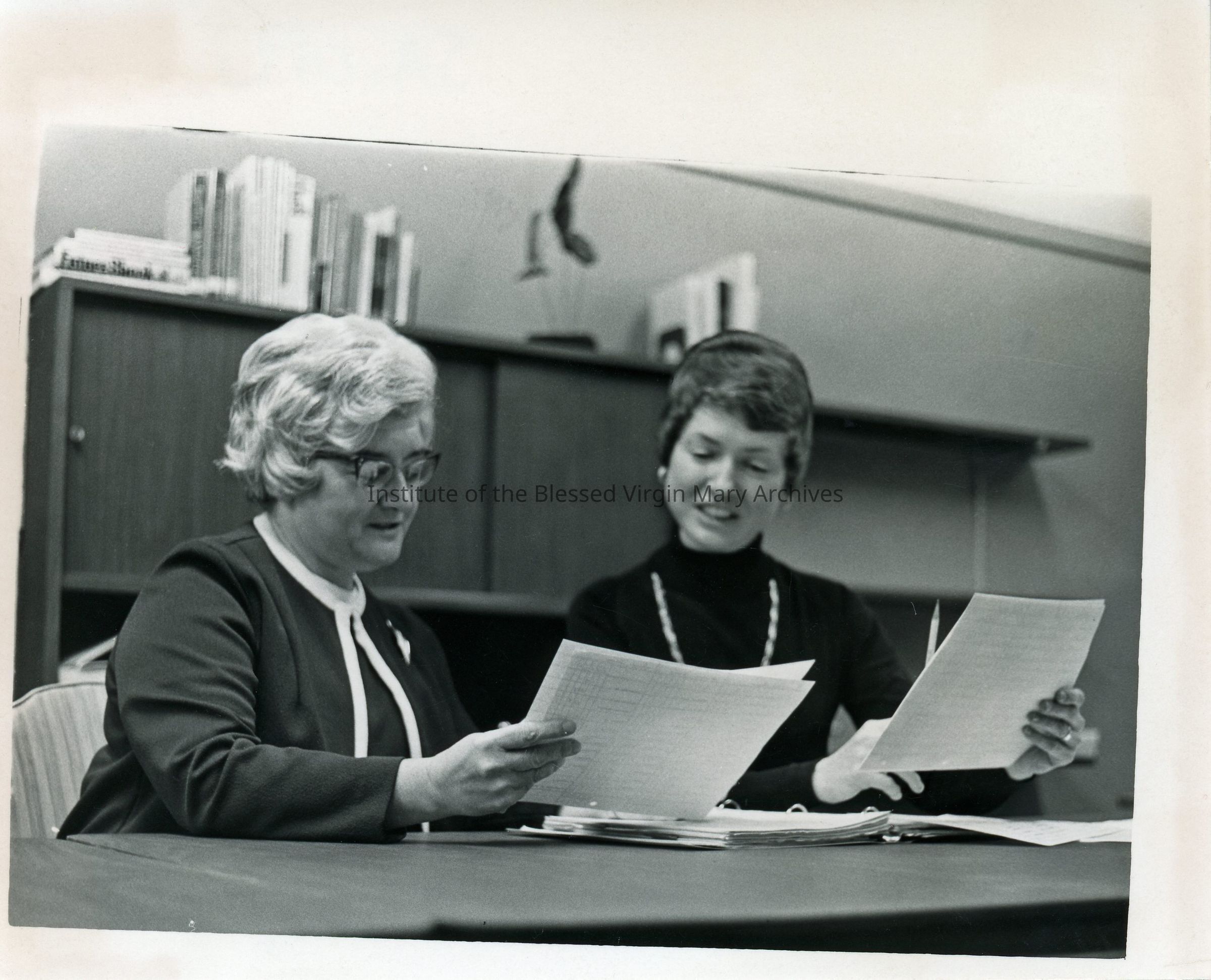 Loretto High School in Sacramento, California. On the left is Sister Nora (St. Catharine) Lowe and on the right is Sister Frances (Maria Regina) Bierer.