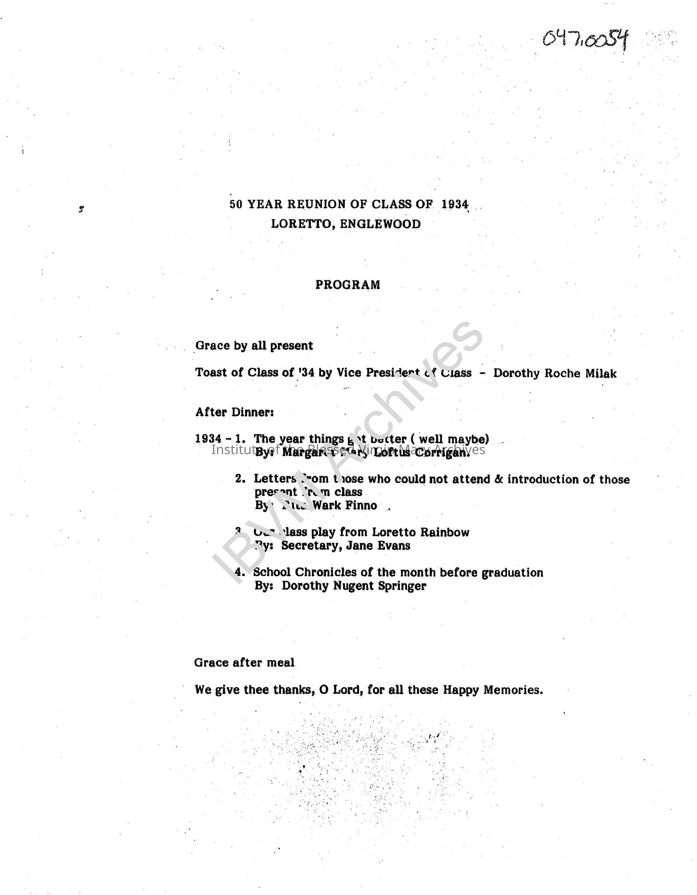 Program for the Loretto High School 50th Anniversary Reunion commemorating the class of 1934. It details a lists of events and features the name of Sister Alice Whitehead on the back. The event was held at the Loretto Convent in Wheaton, Illinois.