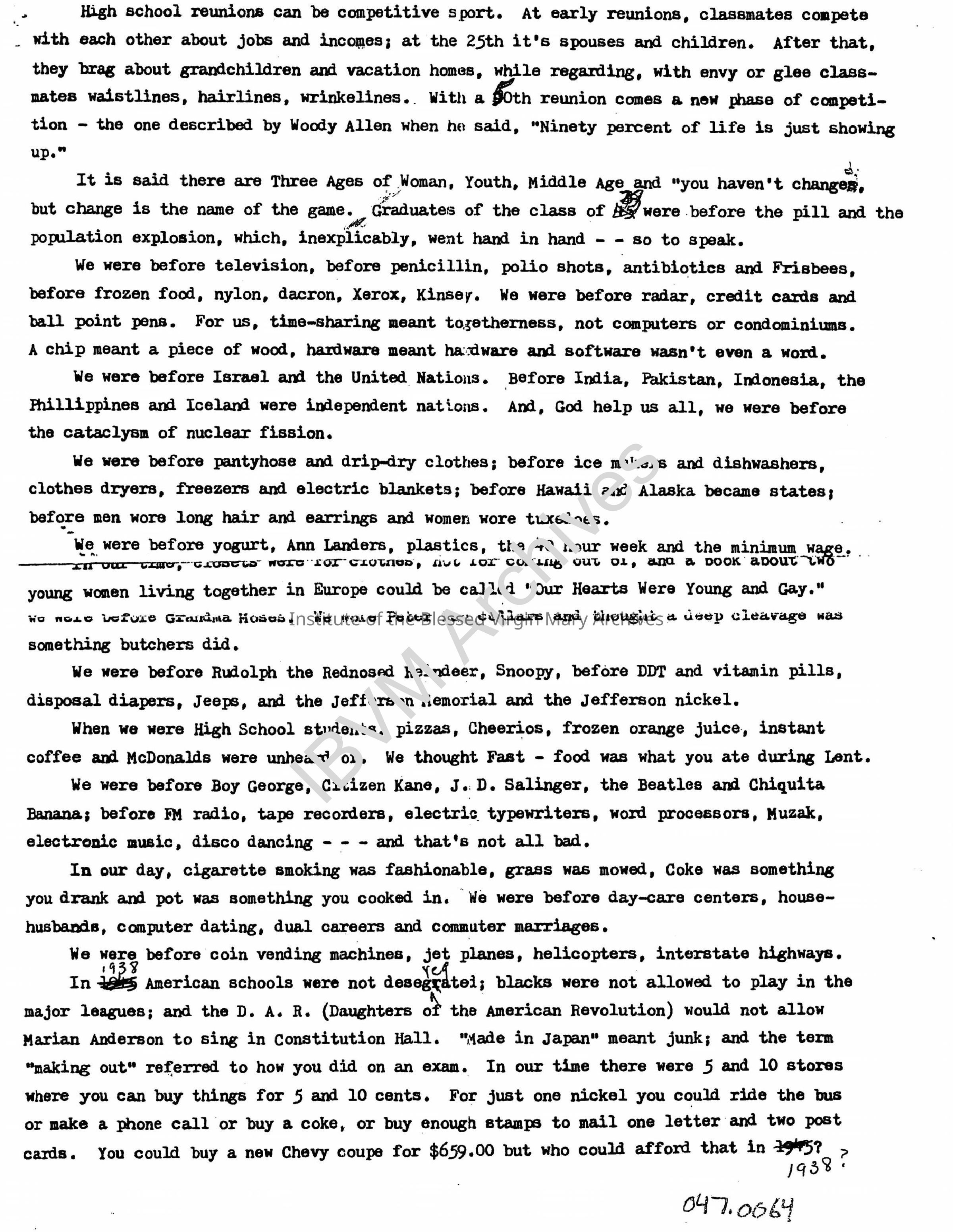 Speech given at the Loretto High School 50th Anniversary Reunion commemorating the Class of 1938. It discusses the many technological and social changes over the previous decades.