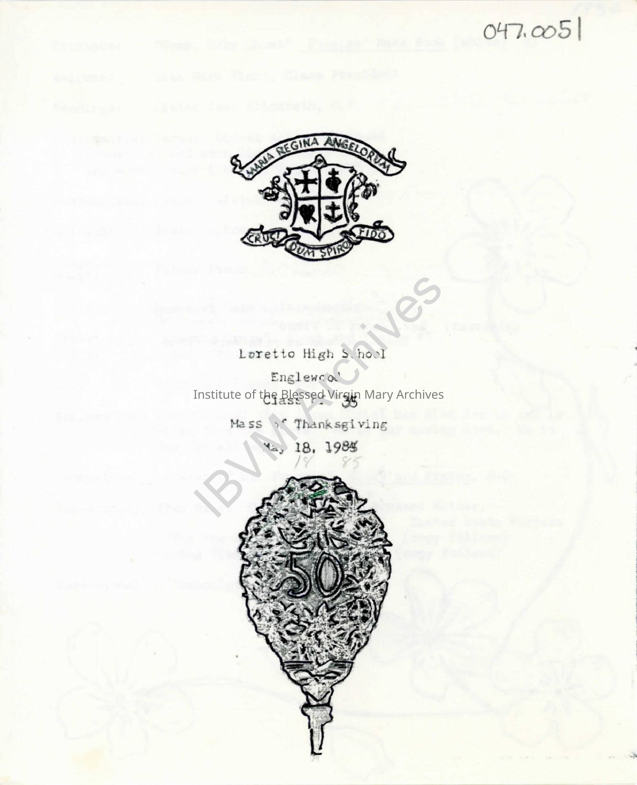 Pamphlet for the Loretto High School Class of 1935 50th Anniversary Liturgy. It contains the order of Mass, music and an image of the school.