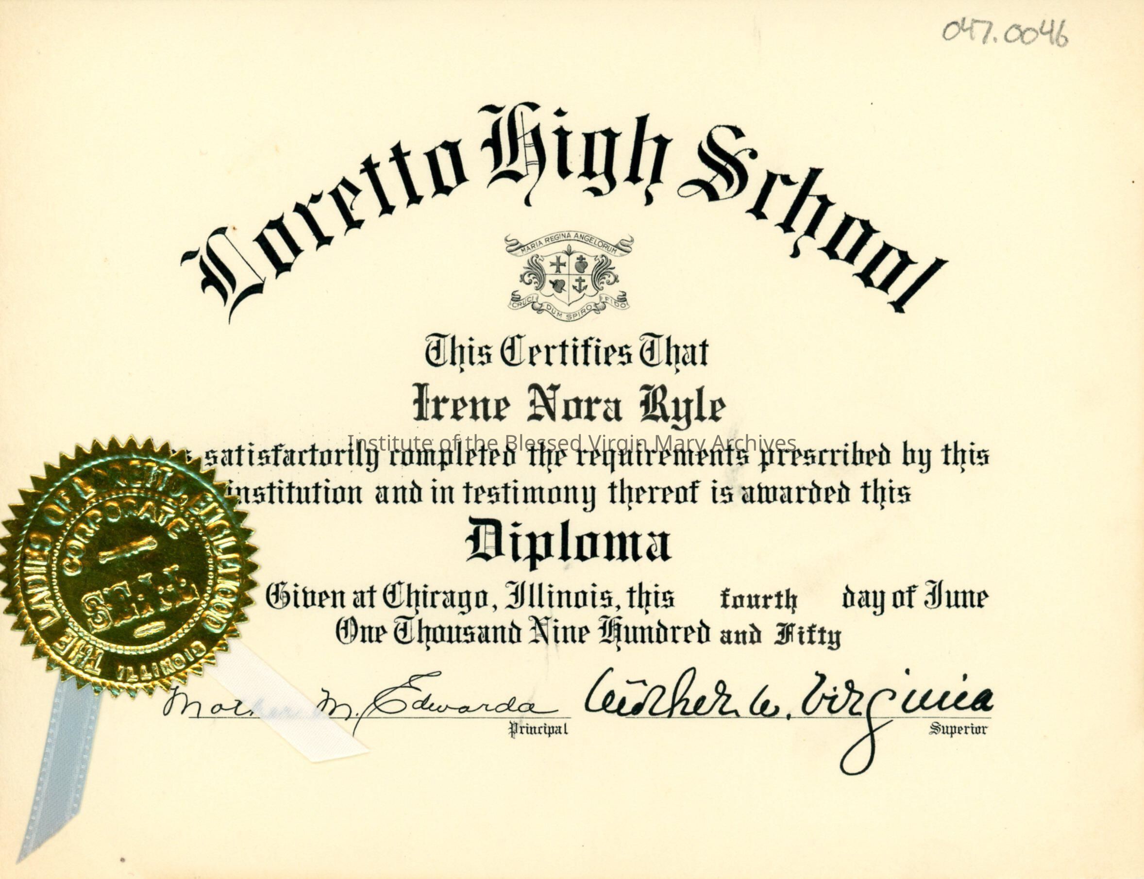 Loretto High School diploma awarded to Irene Nora Ryle. The school was located at 6535 Stewart Avenue in Englewood, Chicago.