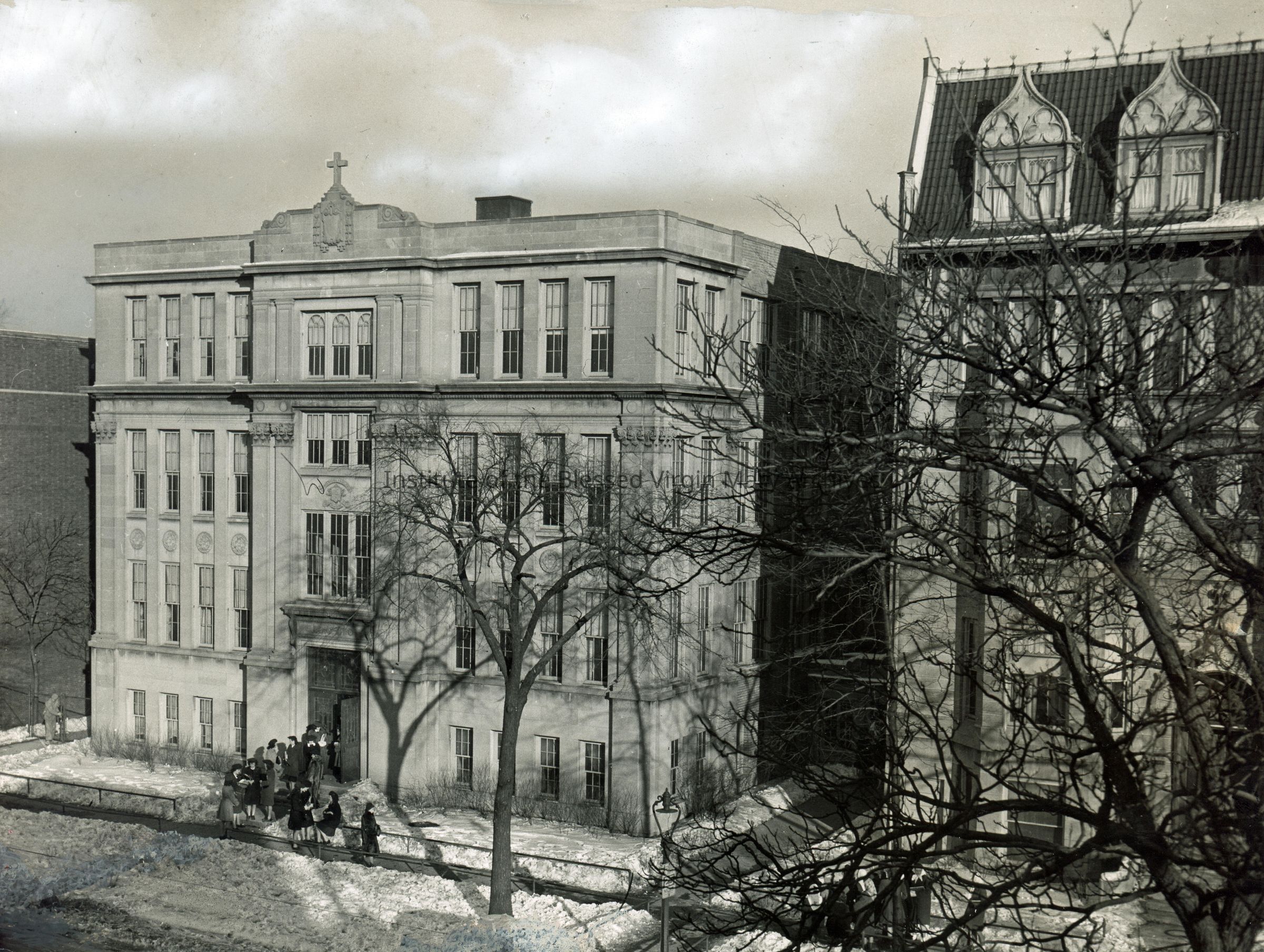 Loretto High School located in the 6500 block of Stewart Avenue in Englewood, Chicago. The Loretto Convent is on the right.