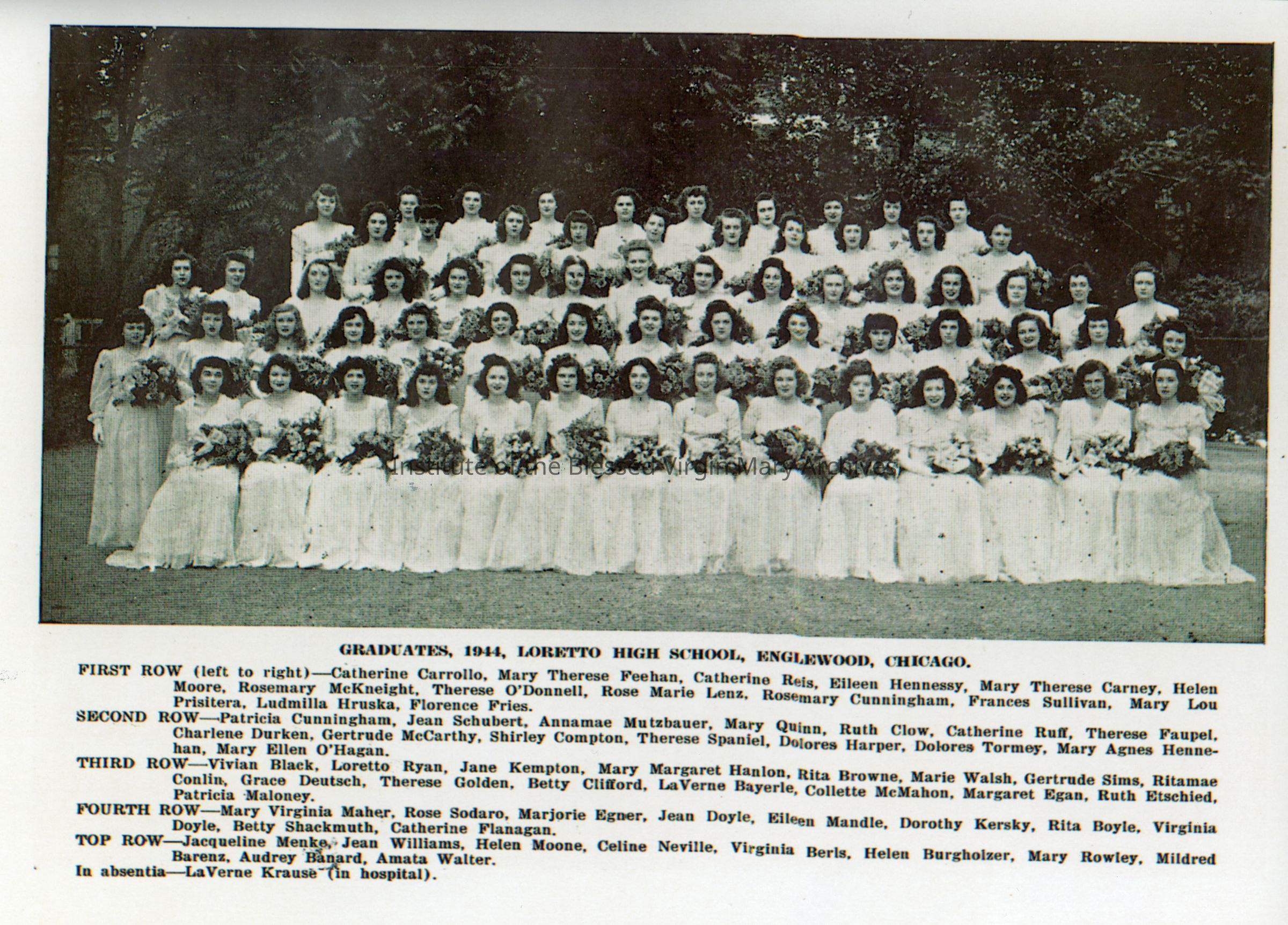 Loretto High School students from the graduating class of 1944. The school was located in the 6500 block of Stewart Avenue in Englewood, Chicago.