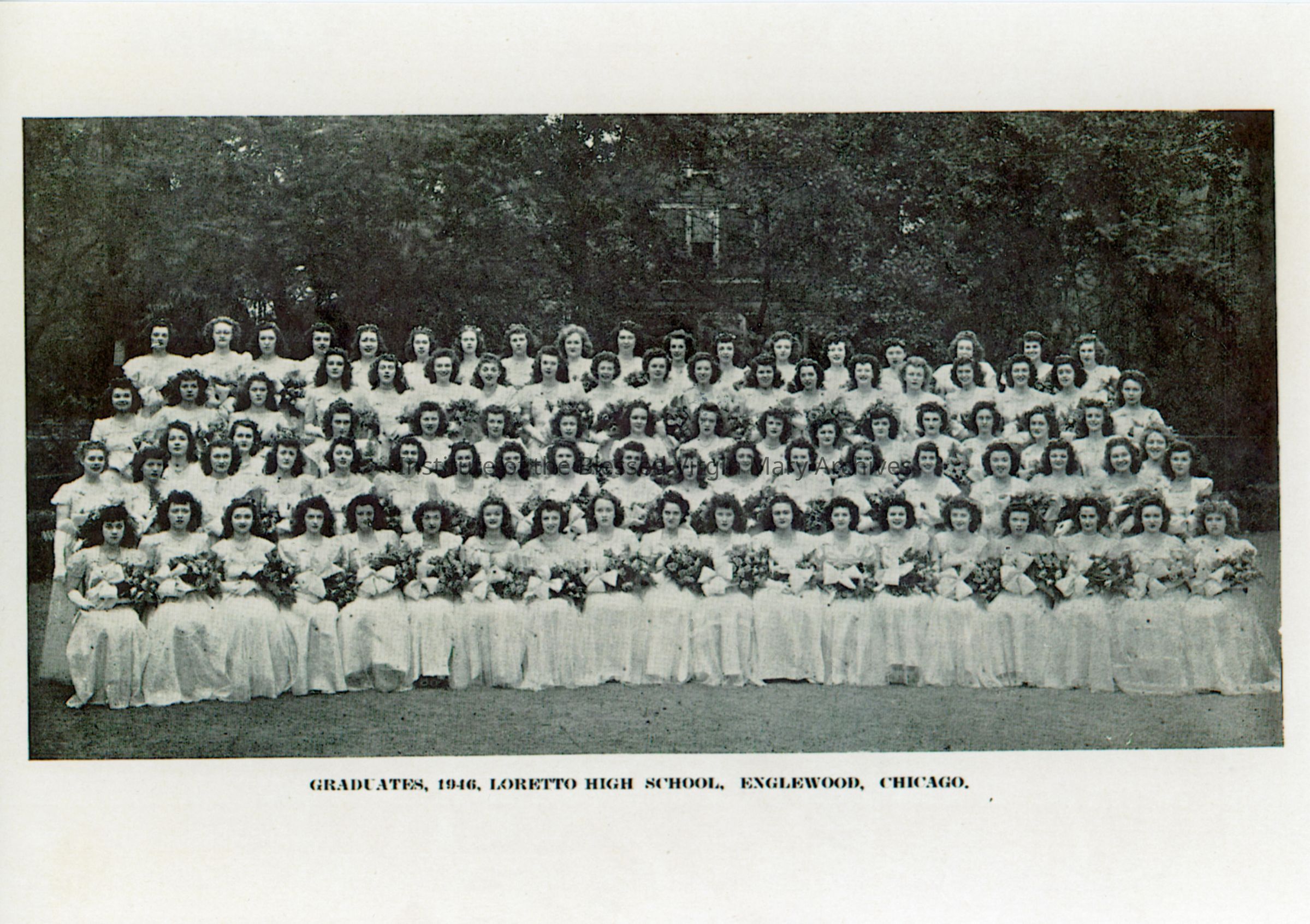 Loretto High School students from the graduating class of 1946. The school was located in the 6500 block of Stewart Avenue in Englewood, Chicago.