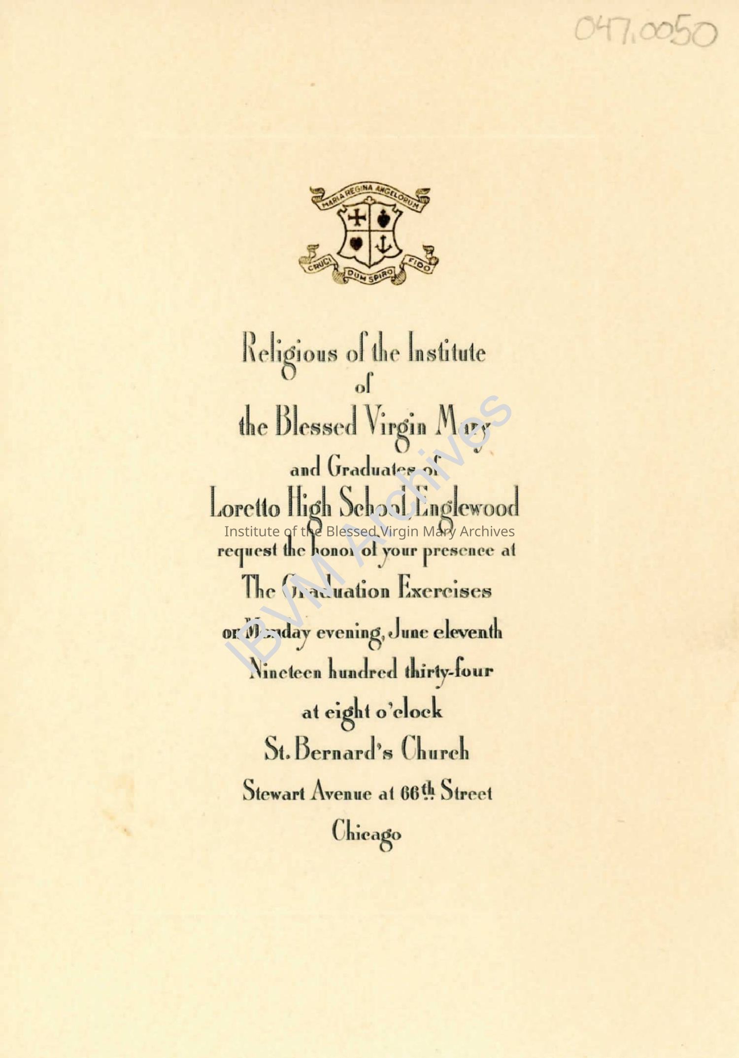 Loretto High School graduation invitation for 1934. The event was held at St. Bernard's Church near Stewart Avenue and 66th Street. The back of the invitation features the name of Helen Deutsch Anderson who graduated that year.
