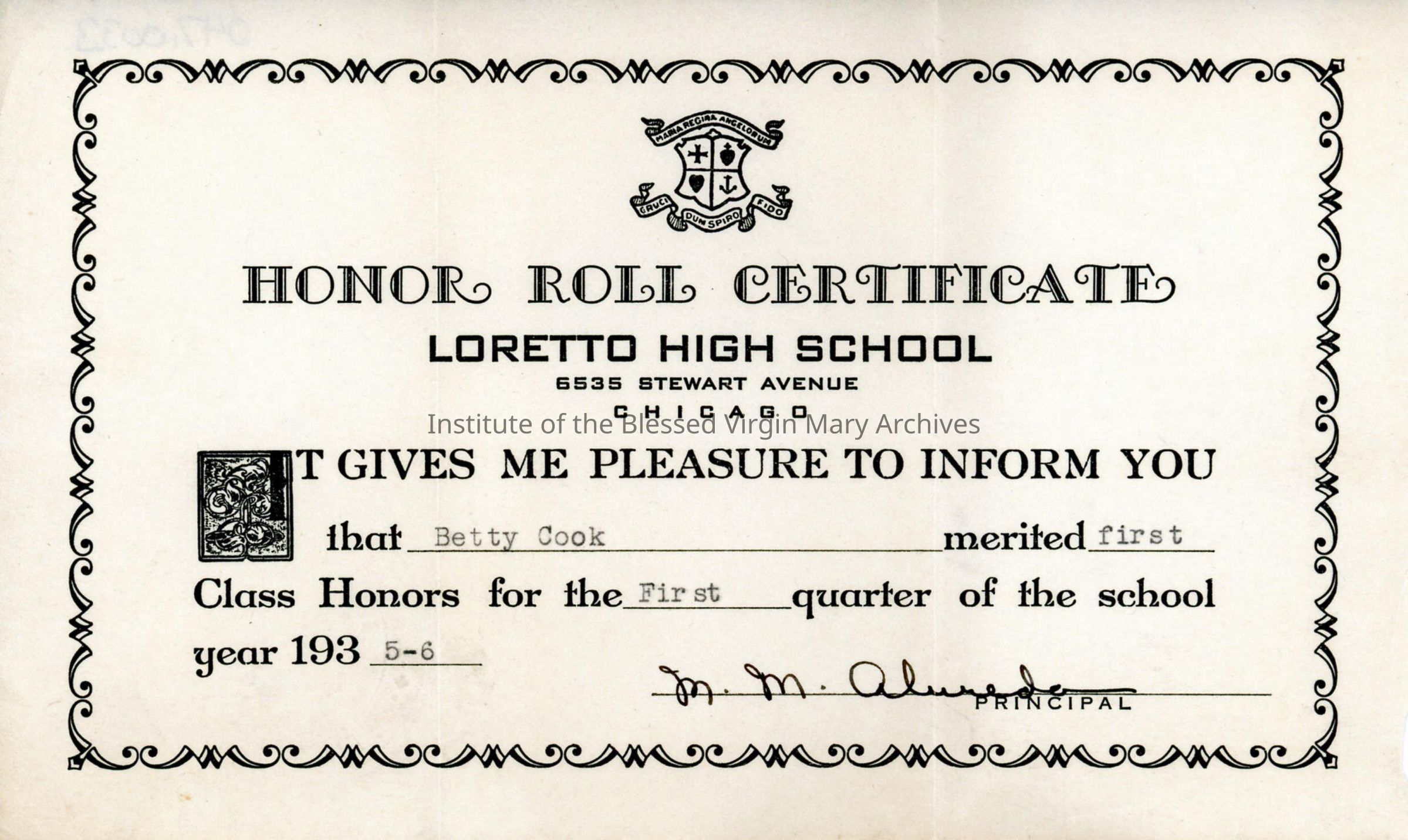 Loretto High School honor roll certificate awarded to Betty Cook. The school was located at 6535 Stewart Avenue in Englewood, Chicago.
