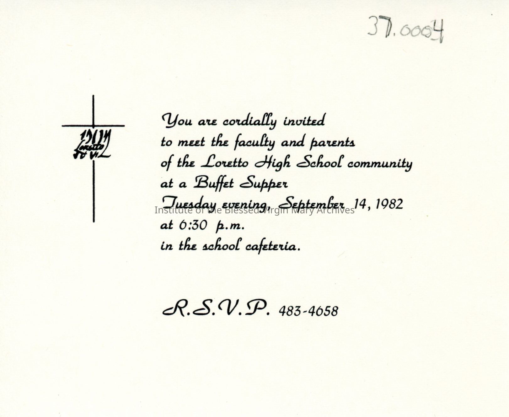 Invitation to a buffet supper held at Loretto High School in Sacramento. The event featured faculty and parents of the school community.