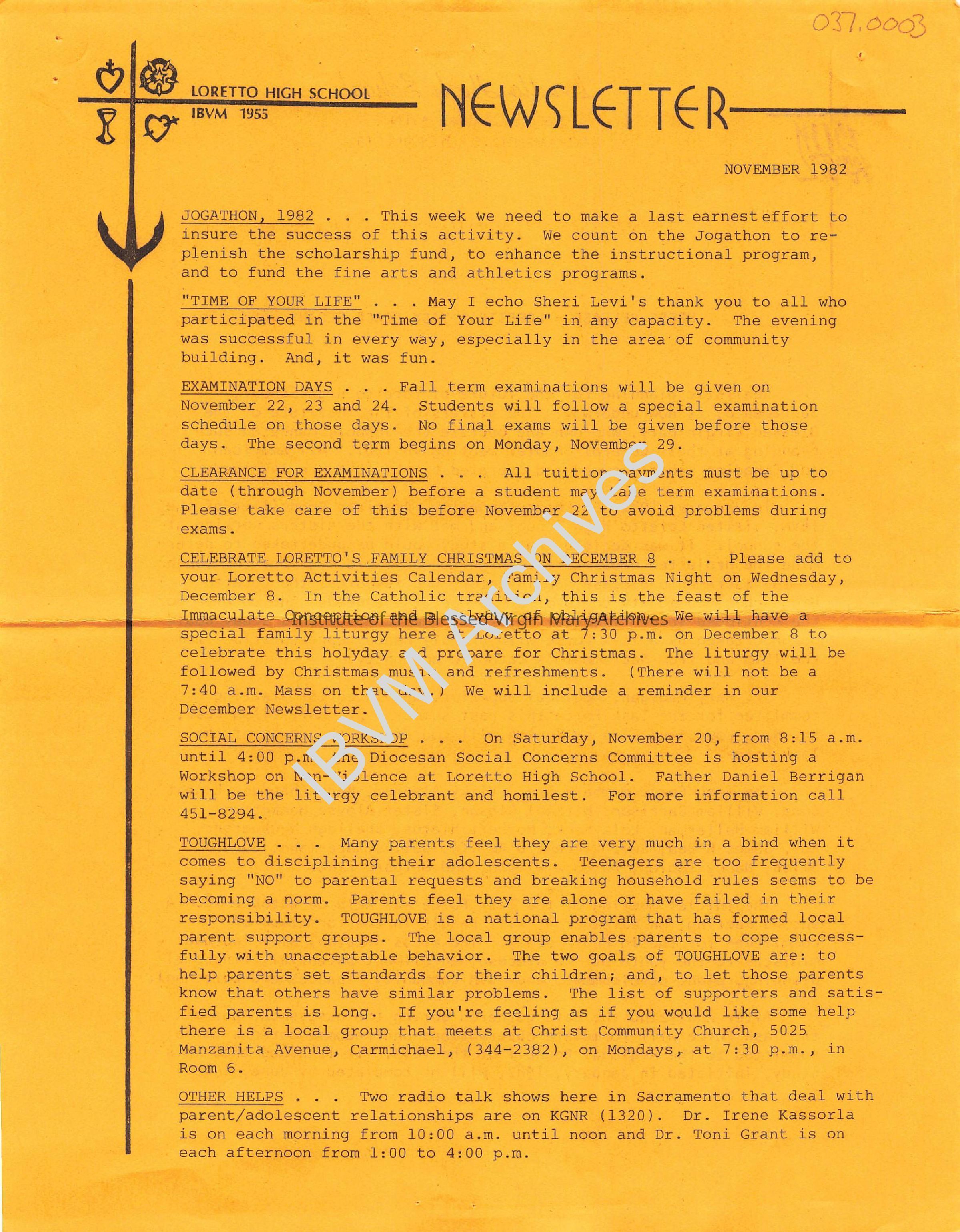 Newsletter from Loretto High School in Sacramento. It discusses current events, parenting, Christmas, exams and more. The back features a press release from the Loretto Task Force. This group was responsible for evaluating the future of IBVM schools across the United States.