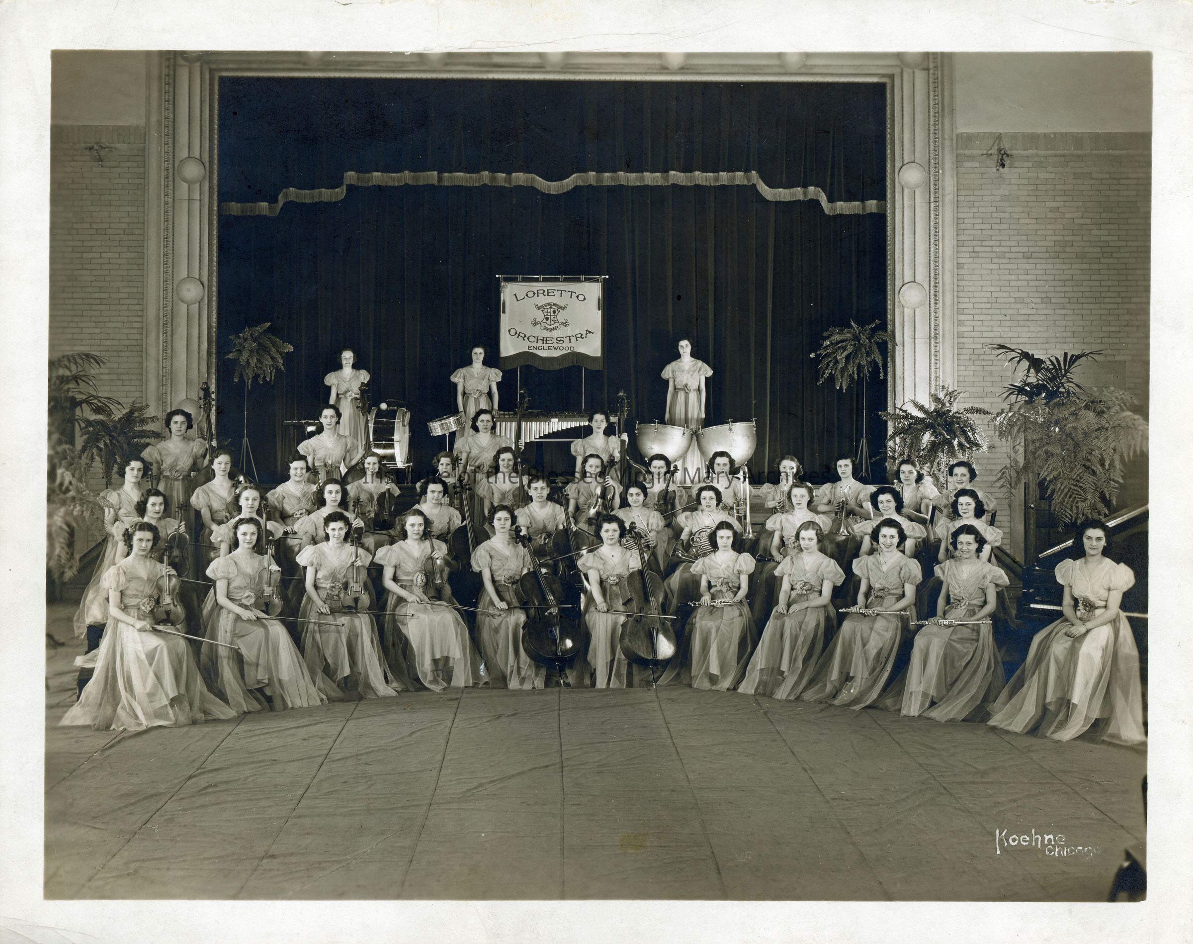 Loretto High School Orchestra in Englewood, Chicago. Future IBVM Sisters Mary Madigan (bass) and Anastasia O'Connor (flute) are identified. The school was located in the 6500 block of Stewart Avenue.
