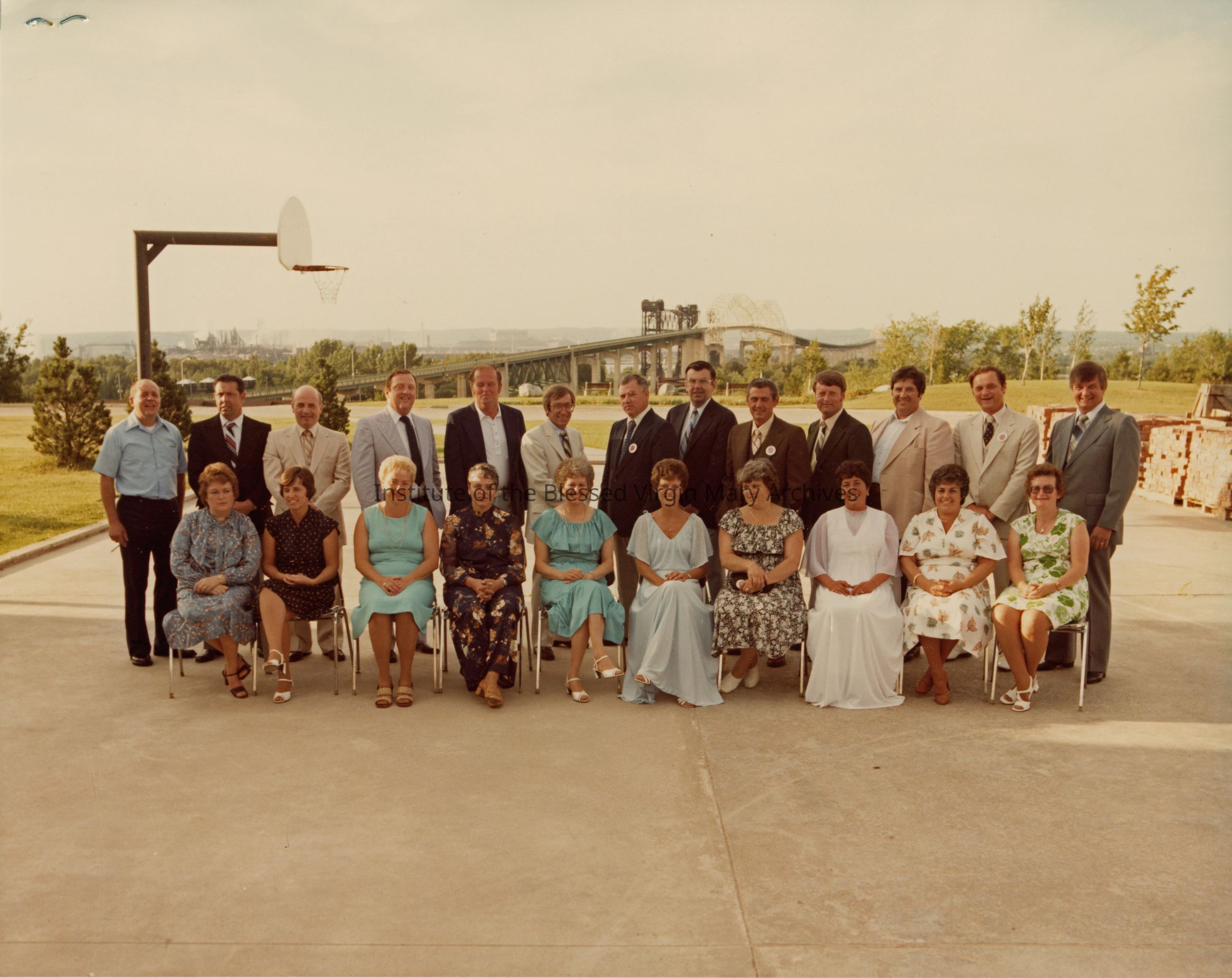 Loretto High School, formerly Loretto Academy, 25th anniversary reunion for the Class of 1955. In the background is the Sault Ste. Marie International Bridge connecting the United States and Canada.