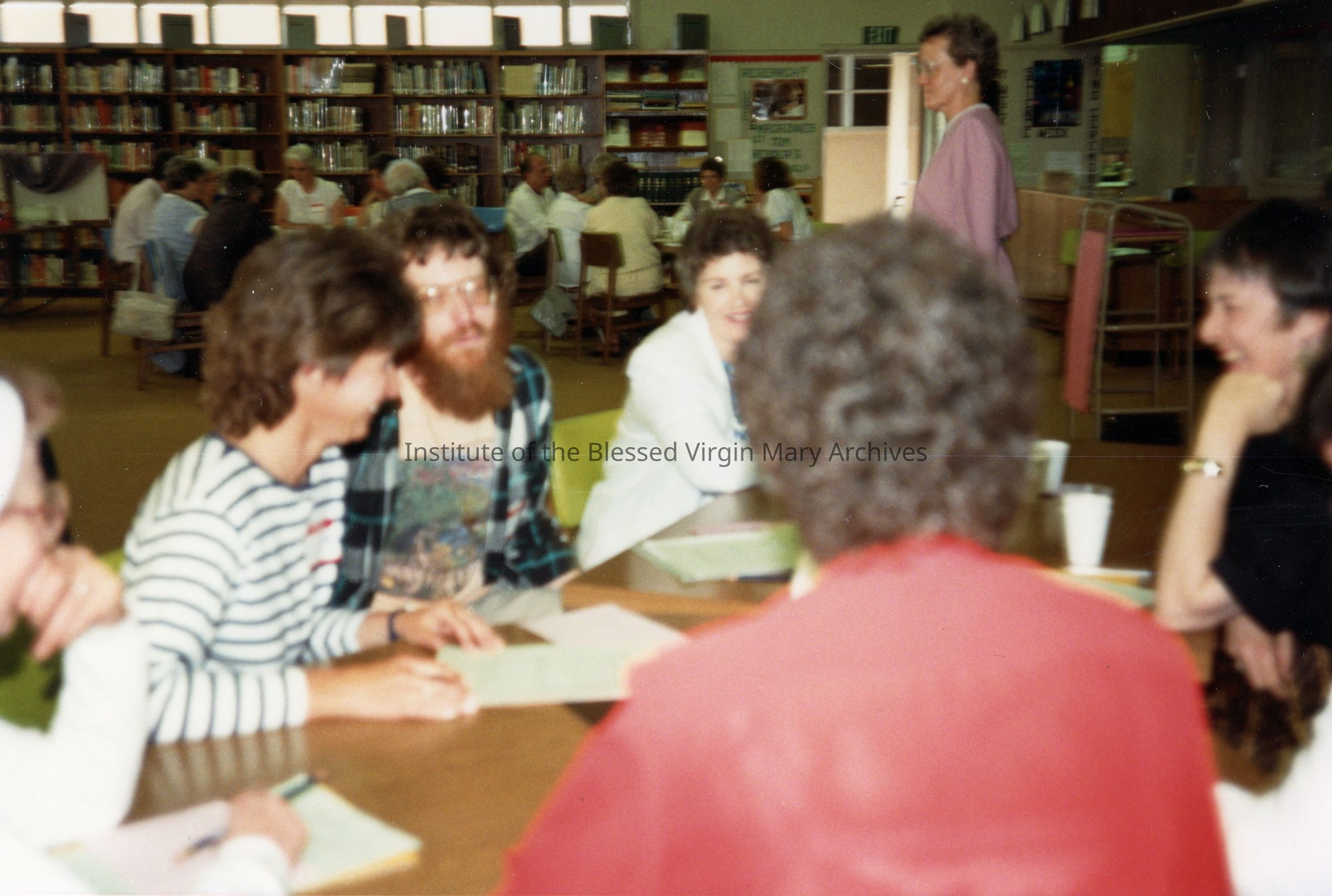 Meeting at Loretto High School in Sacramento, California. LHS faculty member Red Cheever is seated on the left while Sister Arlene (Mary Jonathan) Ashack is on the far right. Sister Lenore (Dorcus) Sullivan, an IBVM from Canada, is standing in the background. The event took place in the school's library.