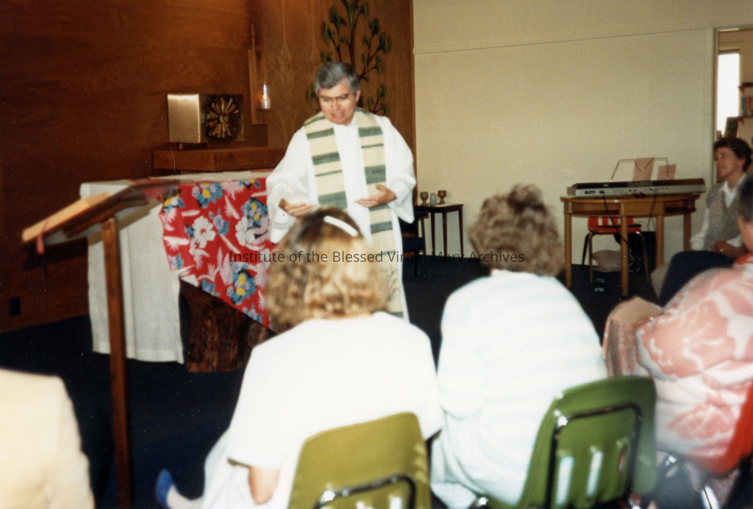 Meeting at Loretto High School in Sacramento, California. Father Philip J. Wells is speaking in the school's chapel. On the far right, Sister Jean Frye and Sister Judy (Mary Brideen) Illig are seated.