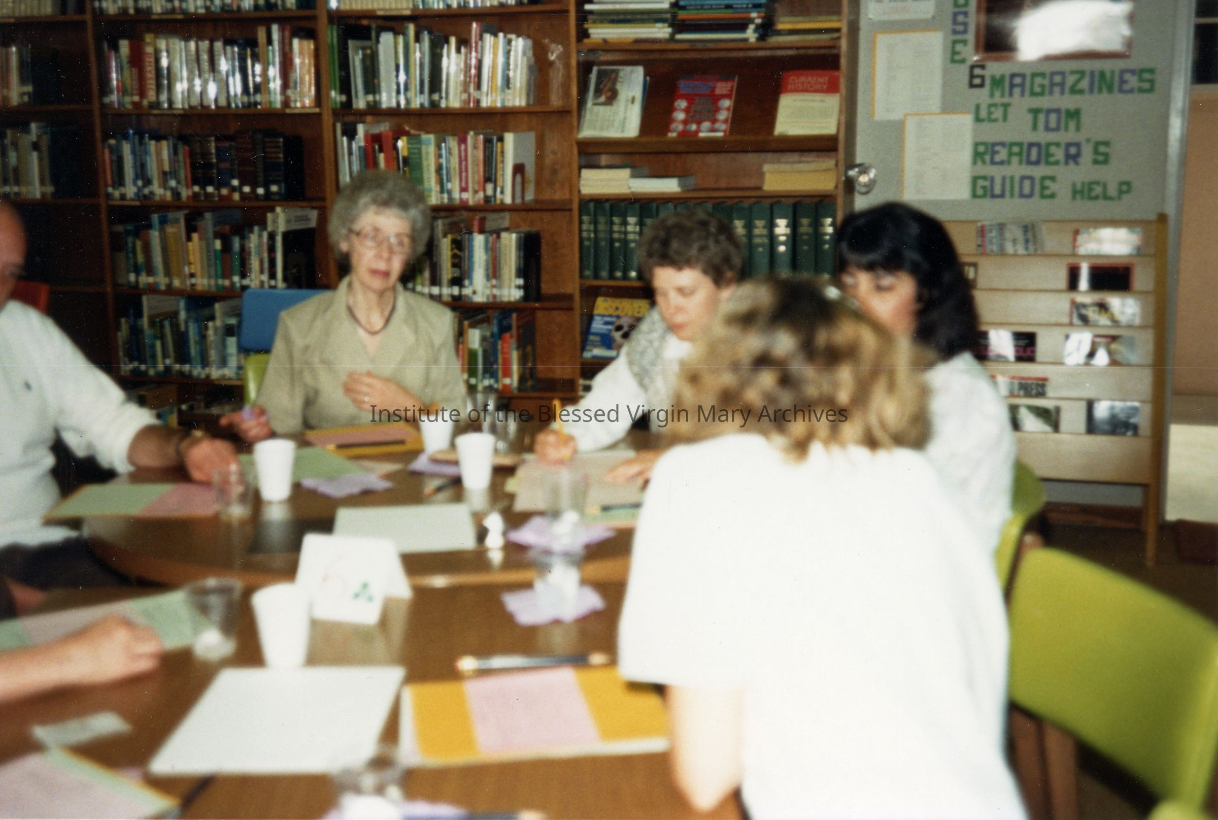 Meeting at Loretto High School in Sacramento, California. Sister Catherine (Celine) Oliva, left, and Sister Judy (Mary Brideen) Illig, right, are seated at the back of the table. The event took place in the school's library.