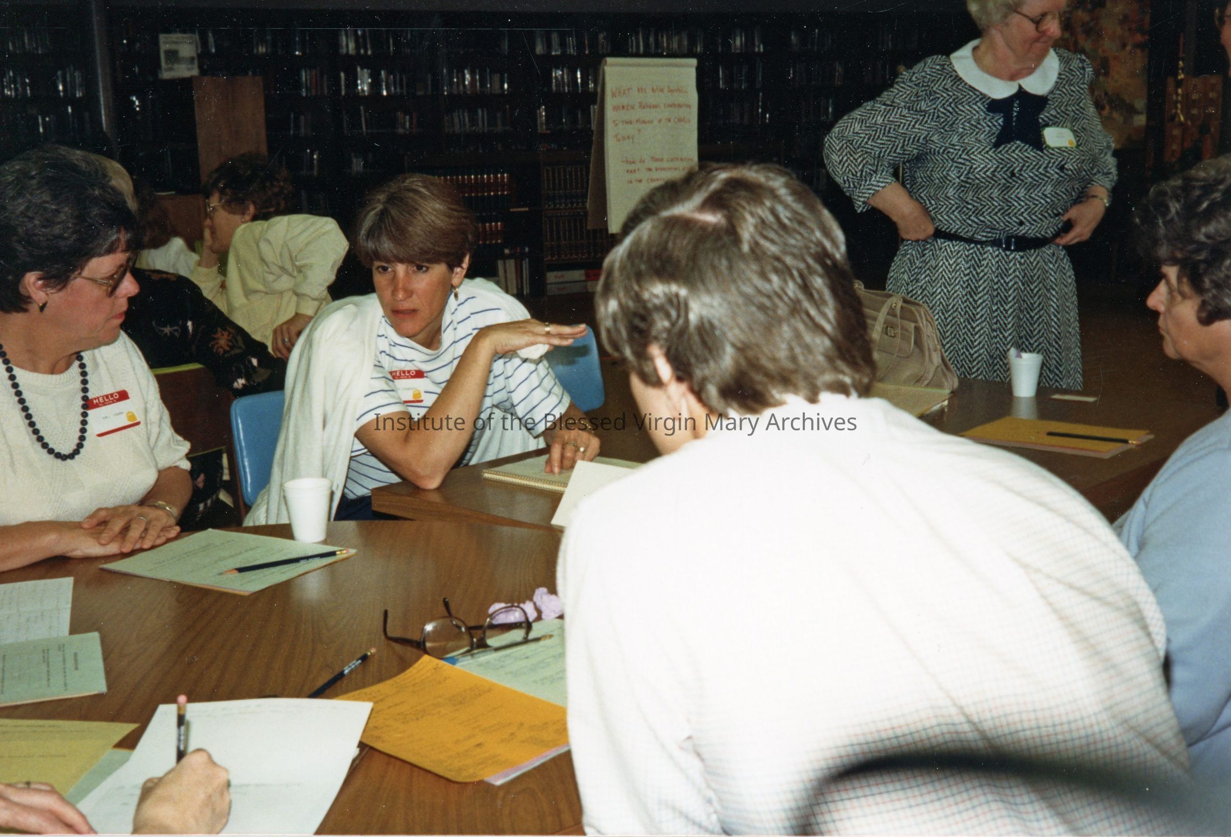 Meeting at Loretto High School in Sacramento, California. Seated on the far left is Sister Gail (Jane Patrice) McKirchy and standing on the far right is Sister Patricia (Anastasia) O'Connor. The event took place in the school's library.