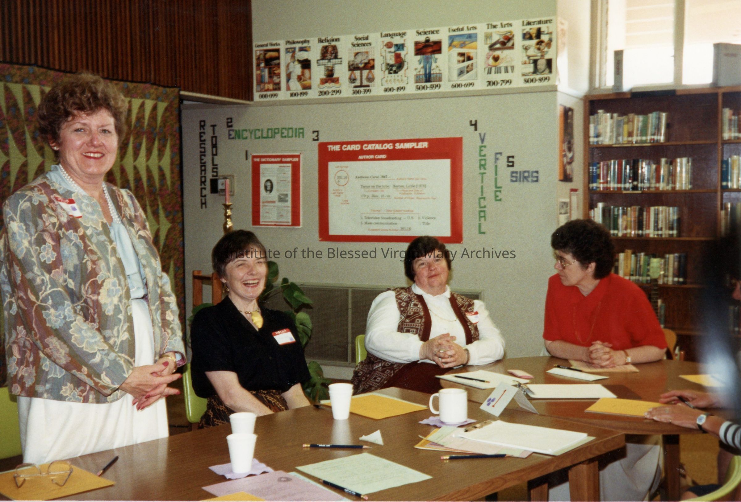 Meeting at Loretto High School in Sacramento, California. From left to right are Barbara Wroblecky, Mary Lembke, Sister Carol Quinn, PBVM and Sister Arlene (Alma) Connolly. The event took place in the school's library.