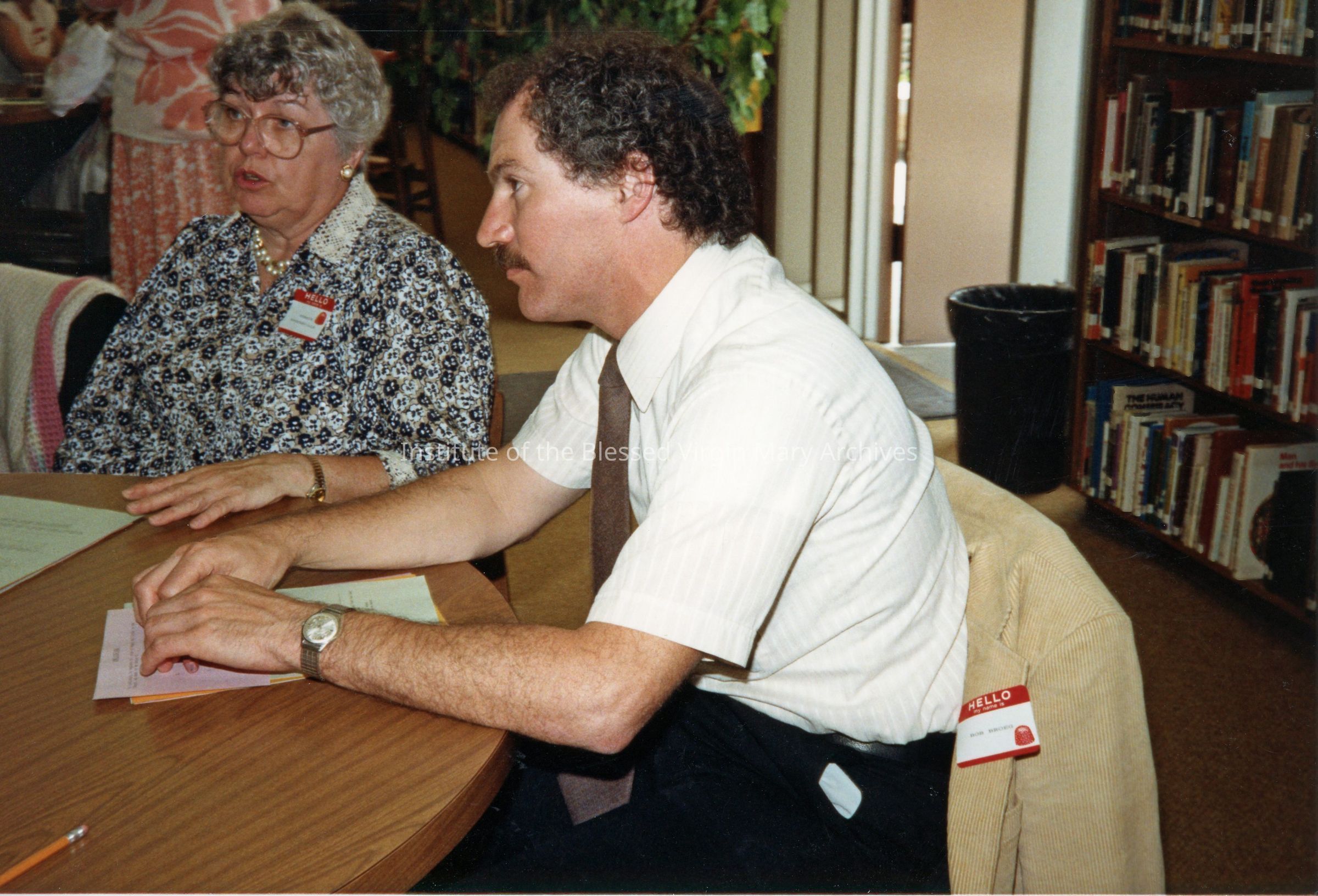 Meeting at Loretto High School in Sacramento, California. From left to right are Geraldine Baskerville and Bob Broeg, SDS. The event took place in the school's library.