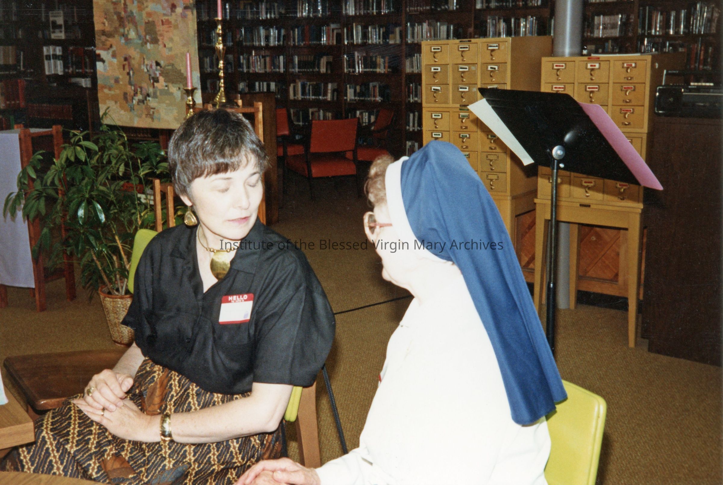 Meeting at Loretto High School in Sacramento, California. From left to right are Mary Lembke and Sister Dorothy (Wilhelmine) Fromm. The event took place in the school's library.