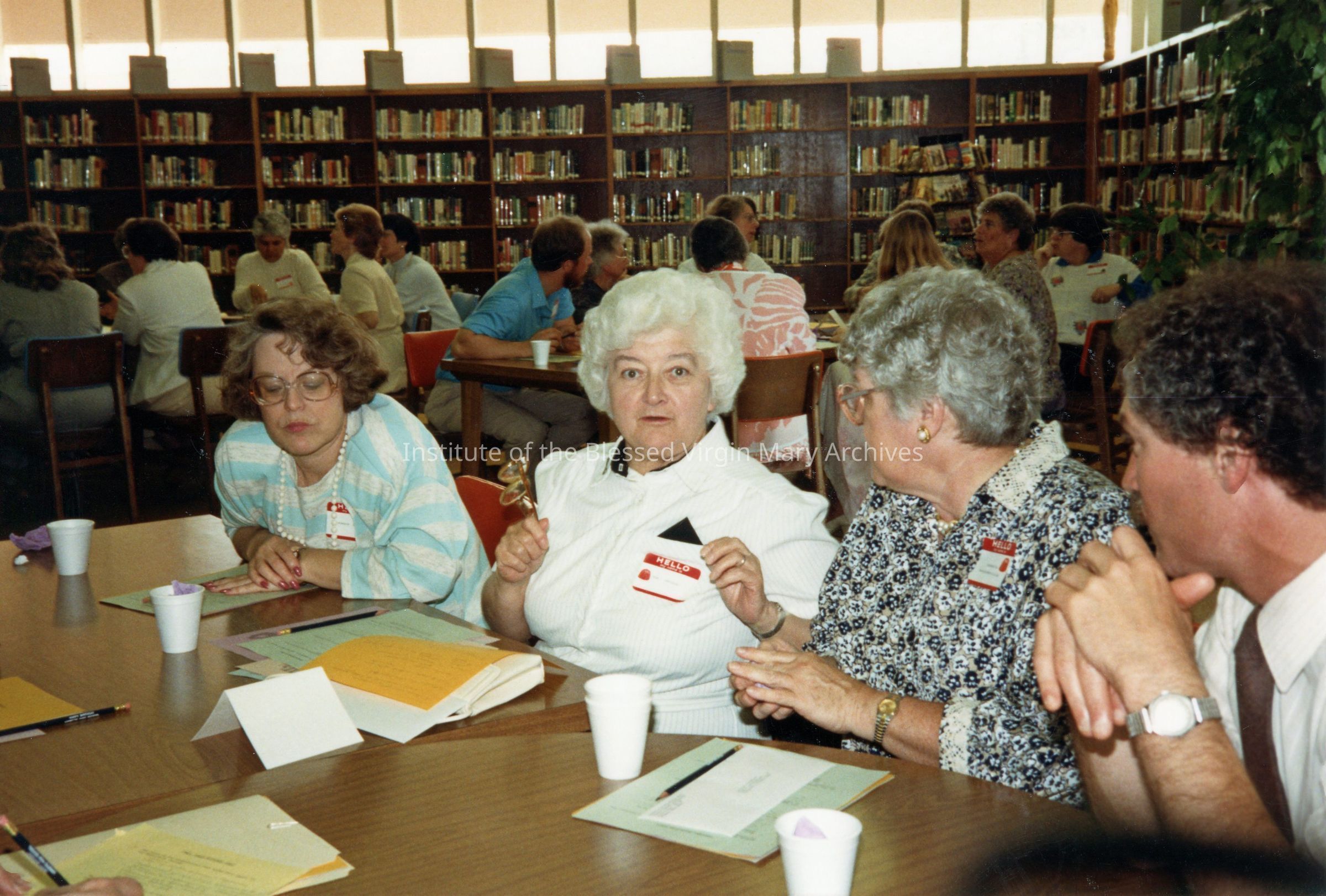 Meeting at Loretto High School in Sacramento, California. From left to right are Sandra Smith, Sister Nora (St. Catharine) Lowe, Geraldine Baskerville and Bob Broeg, SDS. The event took place in the school's library.