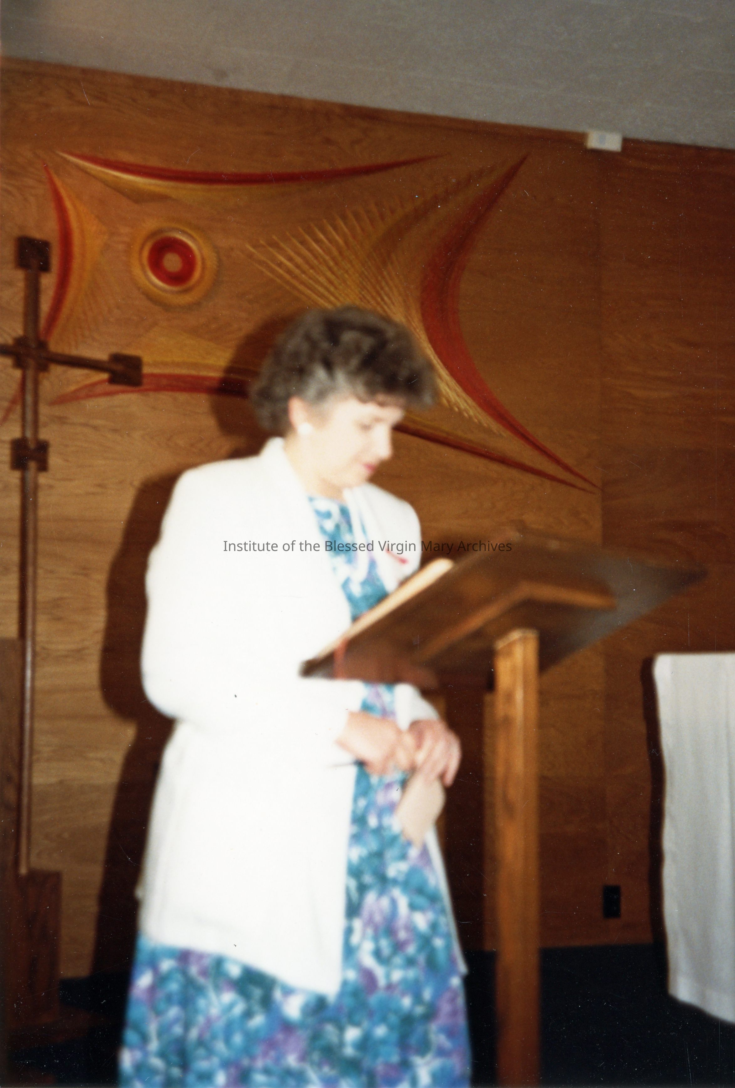 Meeting at Loretto High School in Sacramento, California. Mary O'Reilly is speaking in the school's chapel.