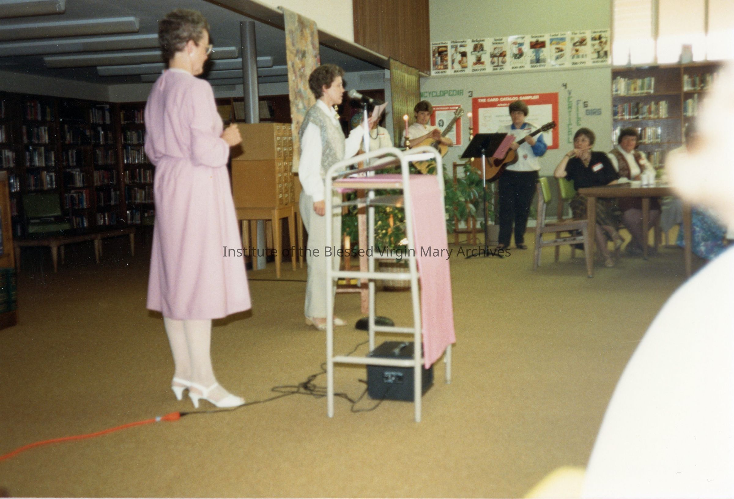 Meeting at Loretto High School in Sacramento, California. On the far left is Sister Lenore (Dorcus) Sullivan, an IBVM from Canada. In addition, Sister Judy (Mary Brideen) Illig is at the microphone and Sister Mary Carton is playing guitar (center). The event took place in the school's library.